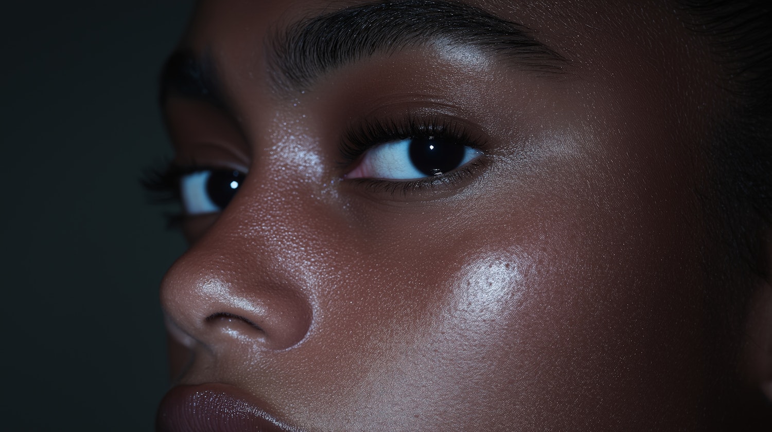 Close-up of a radiant face with glowing skin, expressive eye, and defined brows, set against a dark background for a striking look.