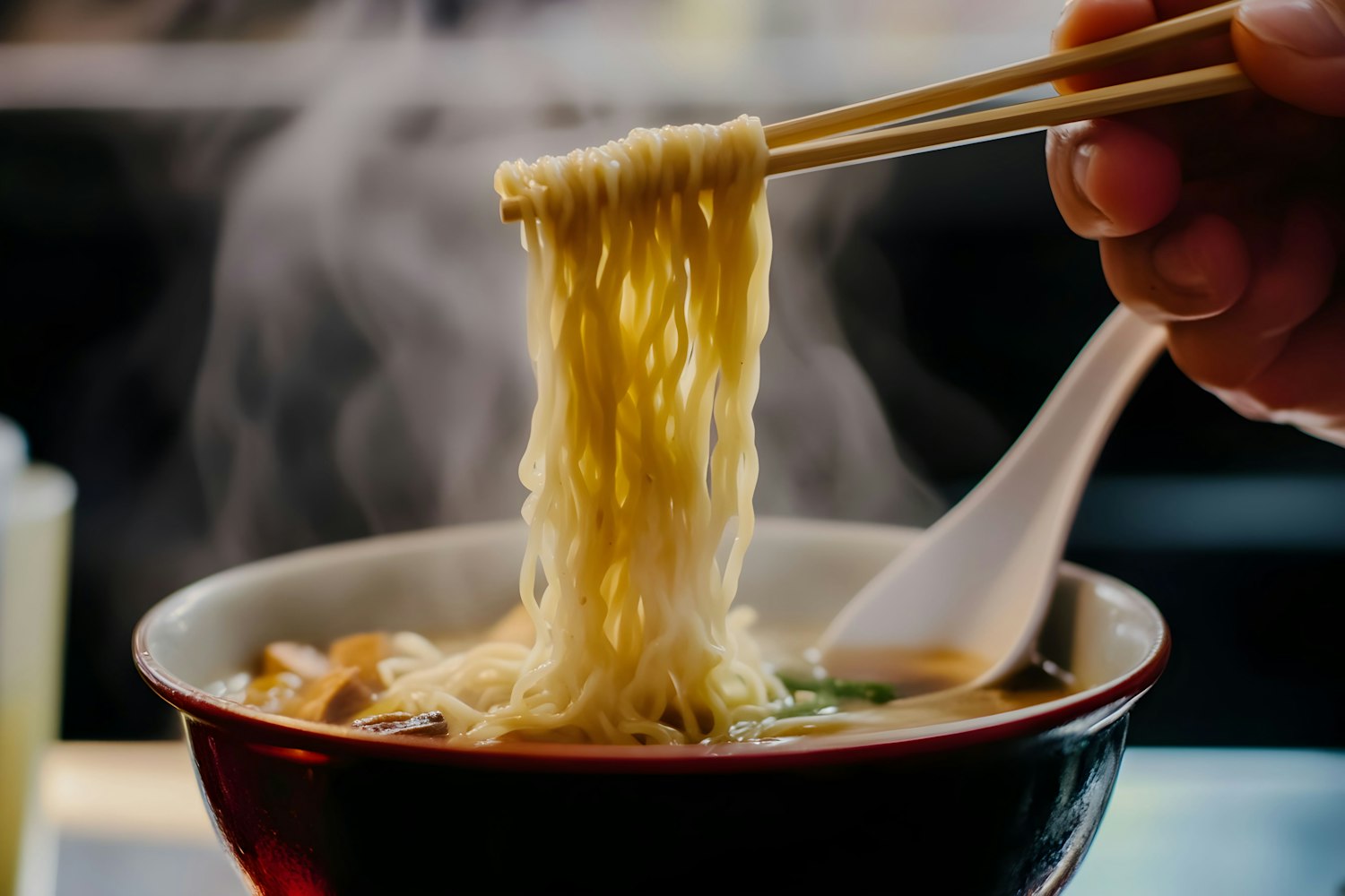 Steaming ramen noodles lifted by chopsticks, with broth and garnishes in a bowl, creating a warm and inviting culinary scene.