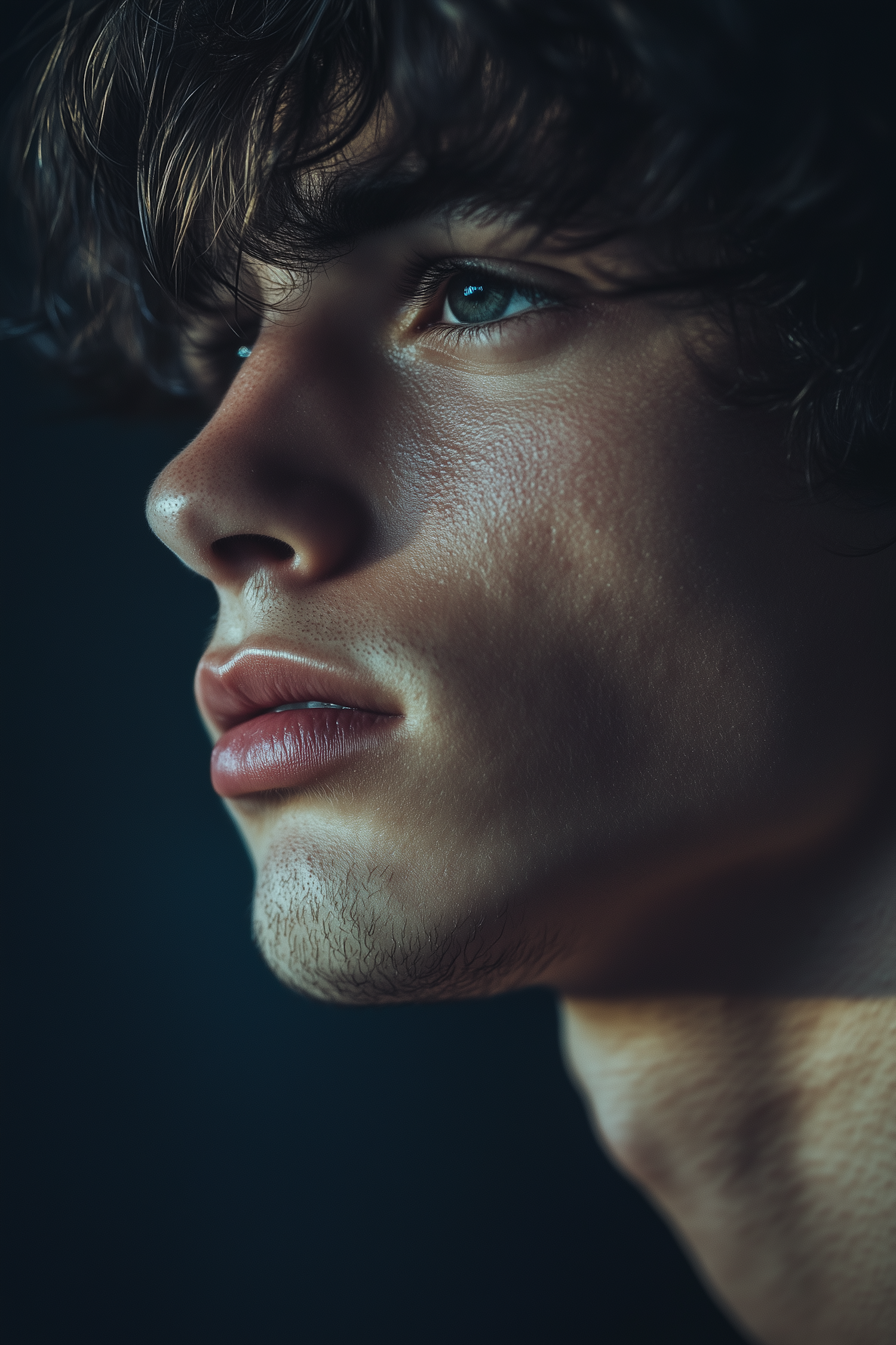 Close-up portrait of a young man with striking blue-green eyes and dark brown hair, gazing thoughtfully. Soft lighting highlights his features.