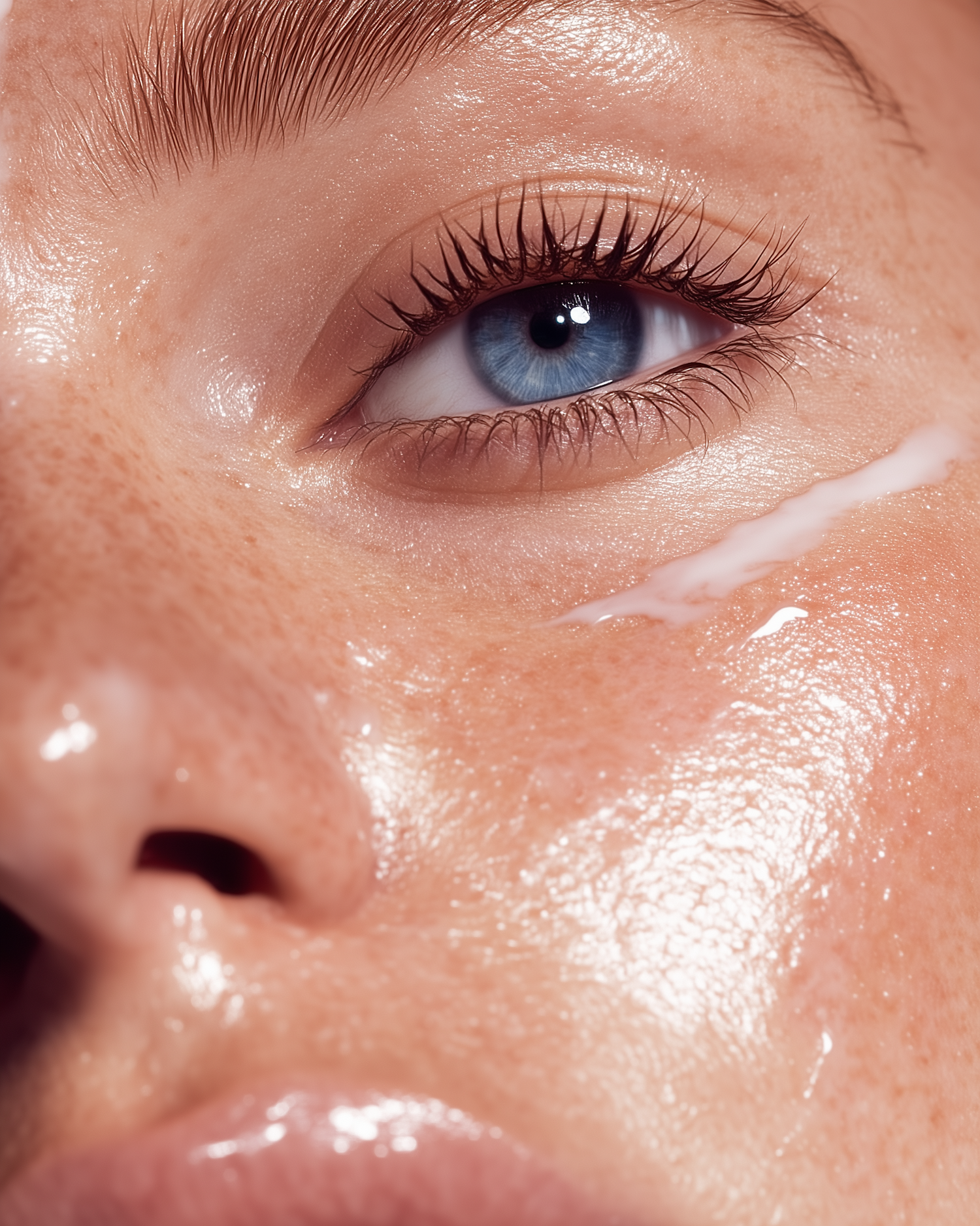 Close-up of a blue eye with long lashes, freckled skin, and a streak of cream under the eye, showcasing a hydrated, glowing complexion.