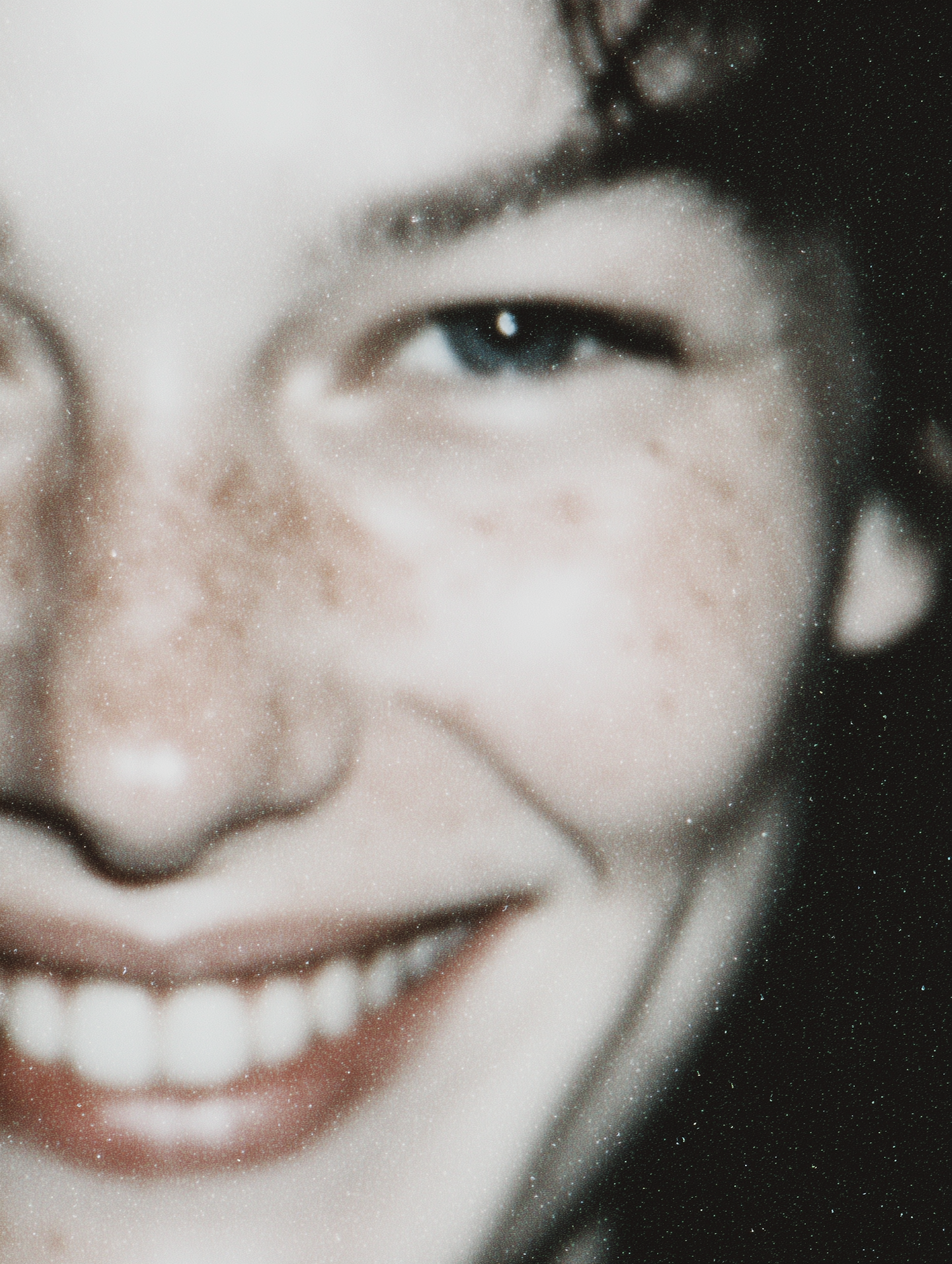 Close-up of a smiling face with freckles, blue eyes, and a grainy vintage texture. The dark background highlights the subject's features.