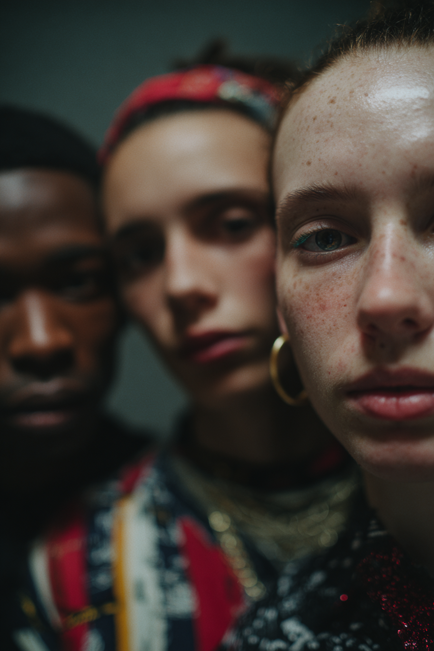 Close-up of three individuals with diverse appearances, focusing on the foreground subject with freckles and hoop earrings.