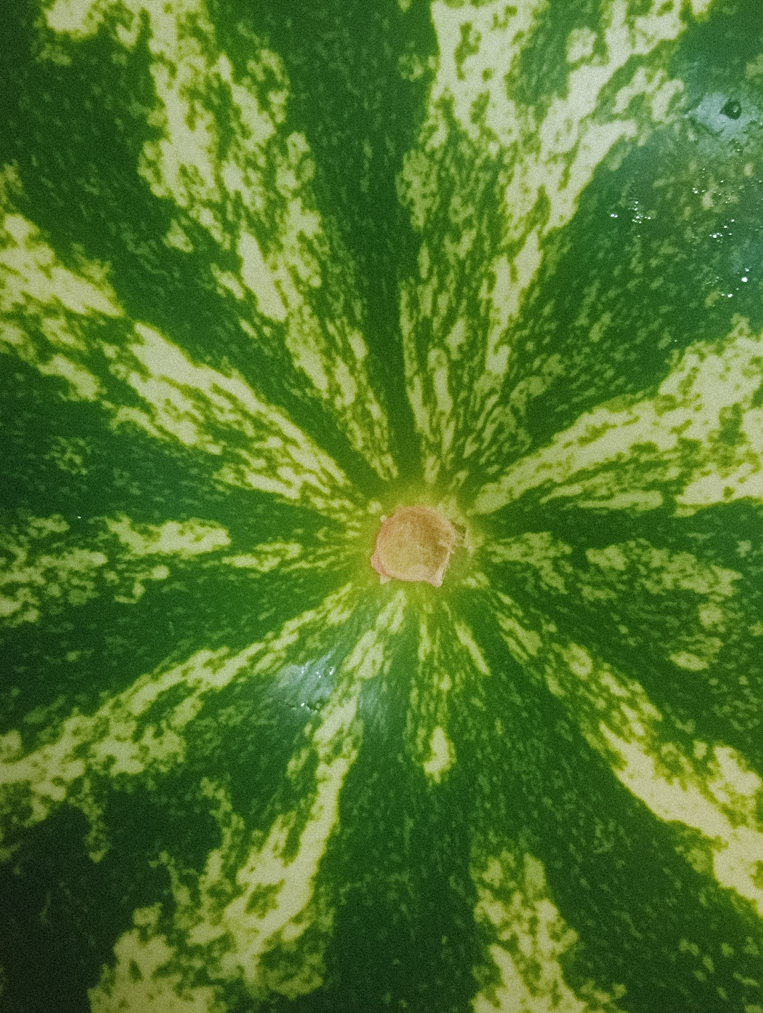 Close-up of a watermelon rind with vibrant green and yellow streaks, showcasing its natural texture and a small scar near the center.