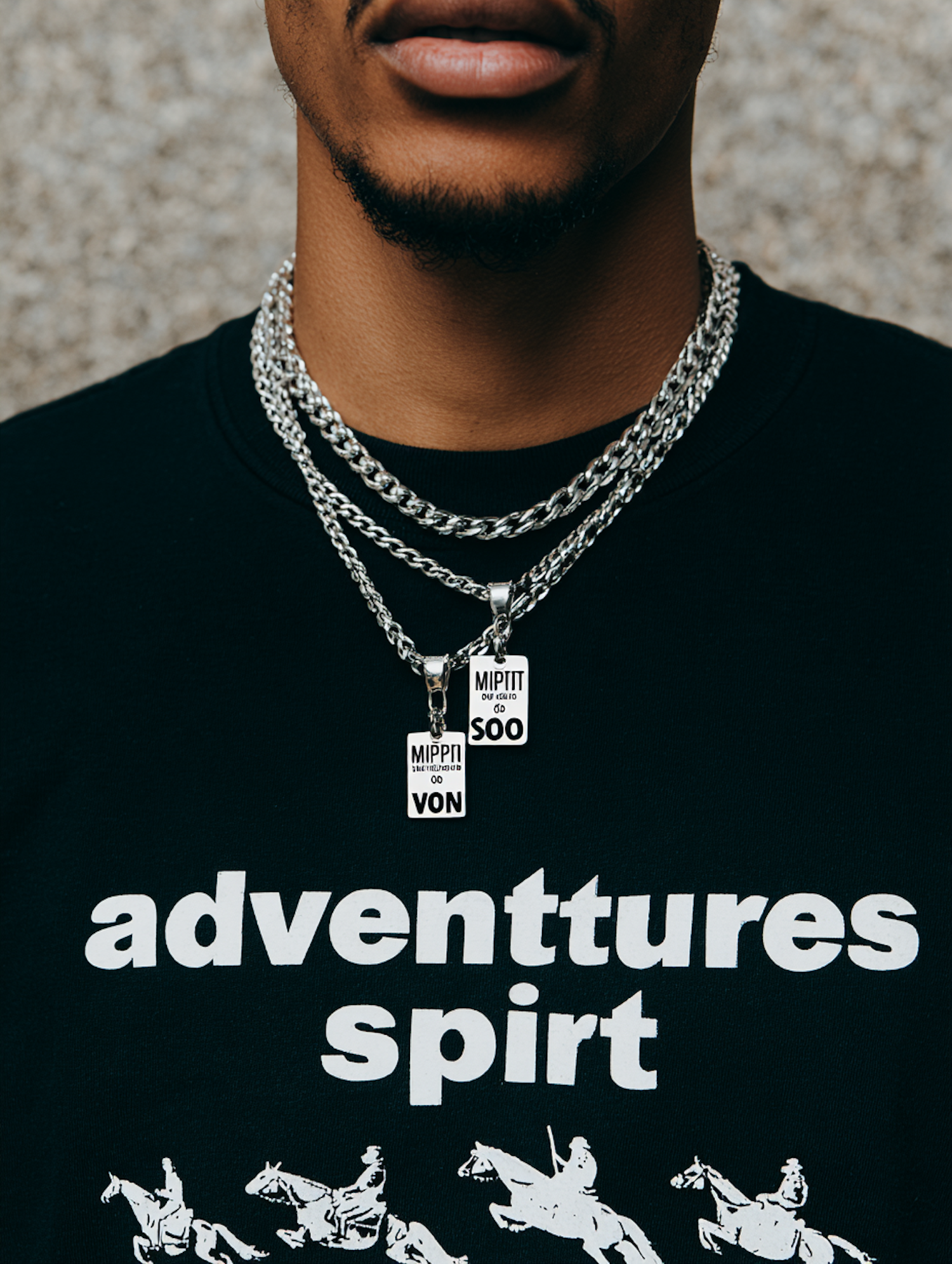 Close-up of a stylish layered necklace and graphic T-shirt with bold text and illustrations, showcasing modern streetwear aesthetics.