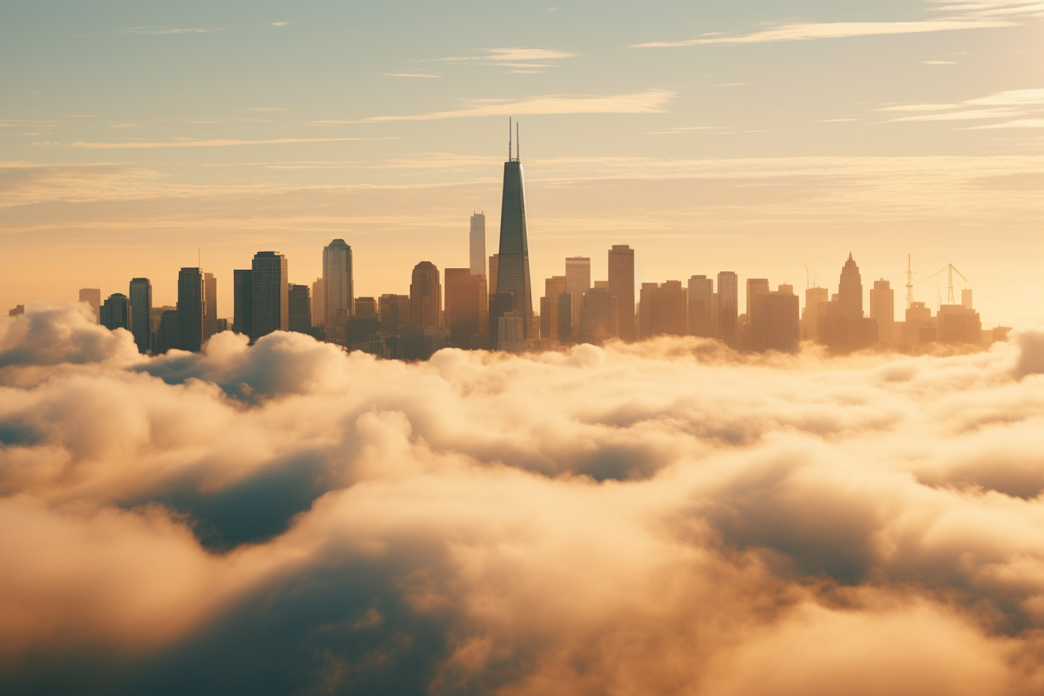 Majestic city skyline emerging from clouds at sunrise, with a tall skyscraper and warm, ethereal lighting.