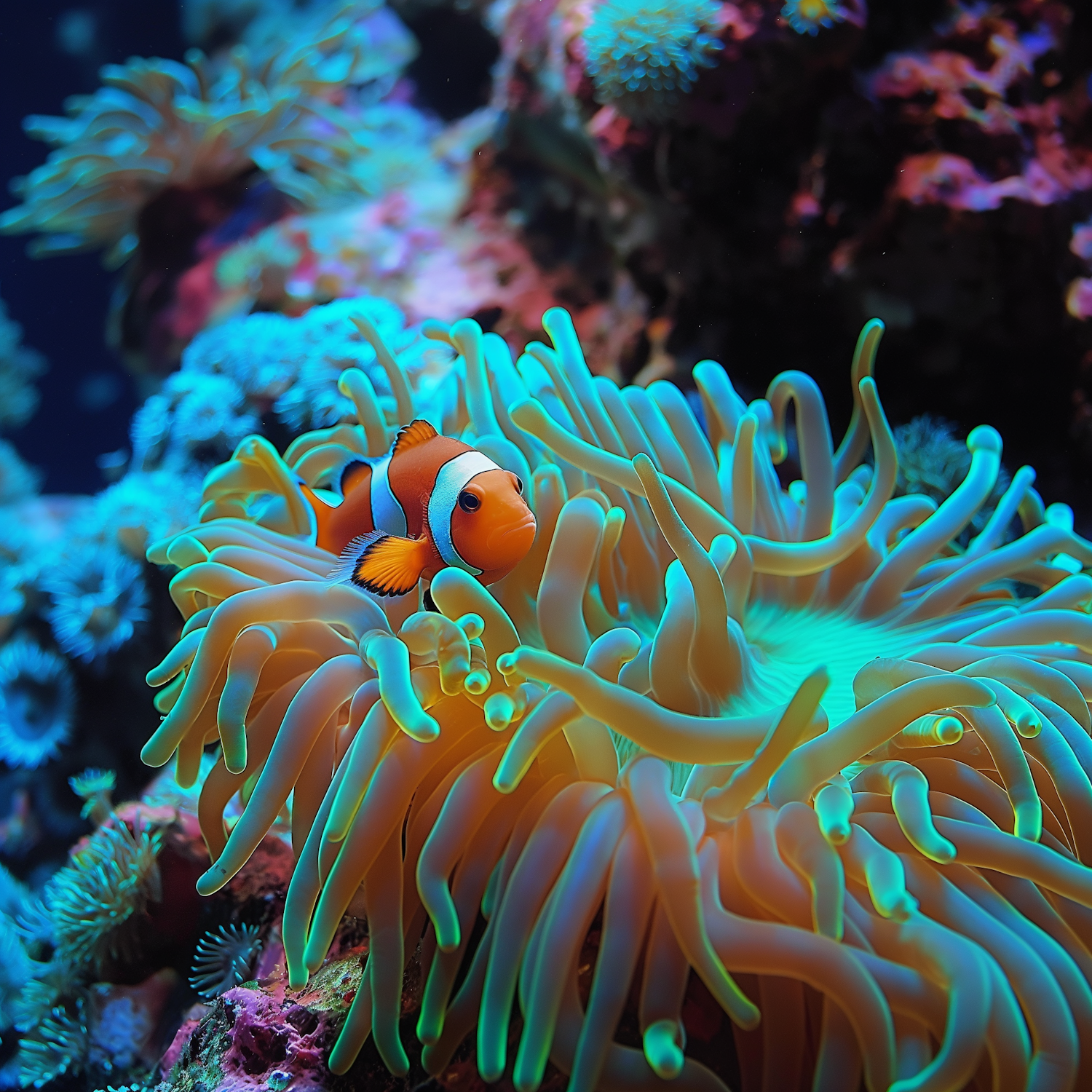 Colorful clownfish nestled in a vibrant sea anemone, surrounded by corals in a stunning underwater scene.