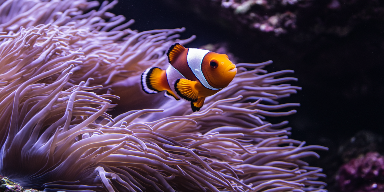 Vibrant clownfish swimming among lavender sea anemone tentacles, creating a striking underwater scene.