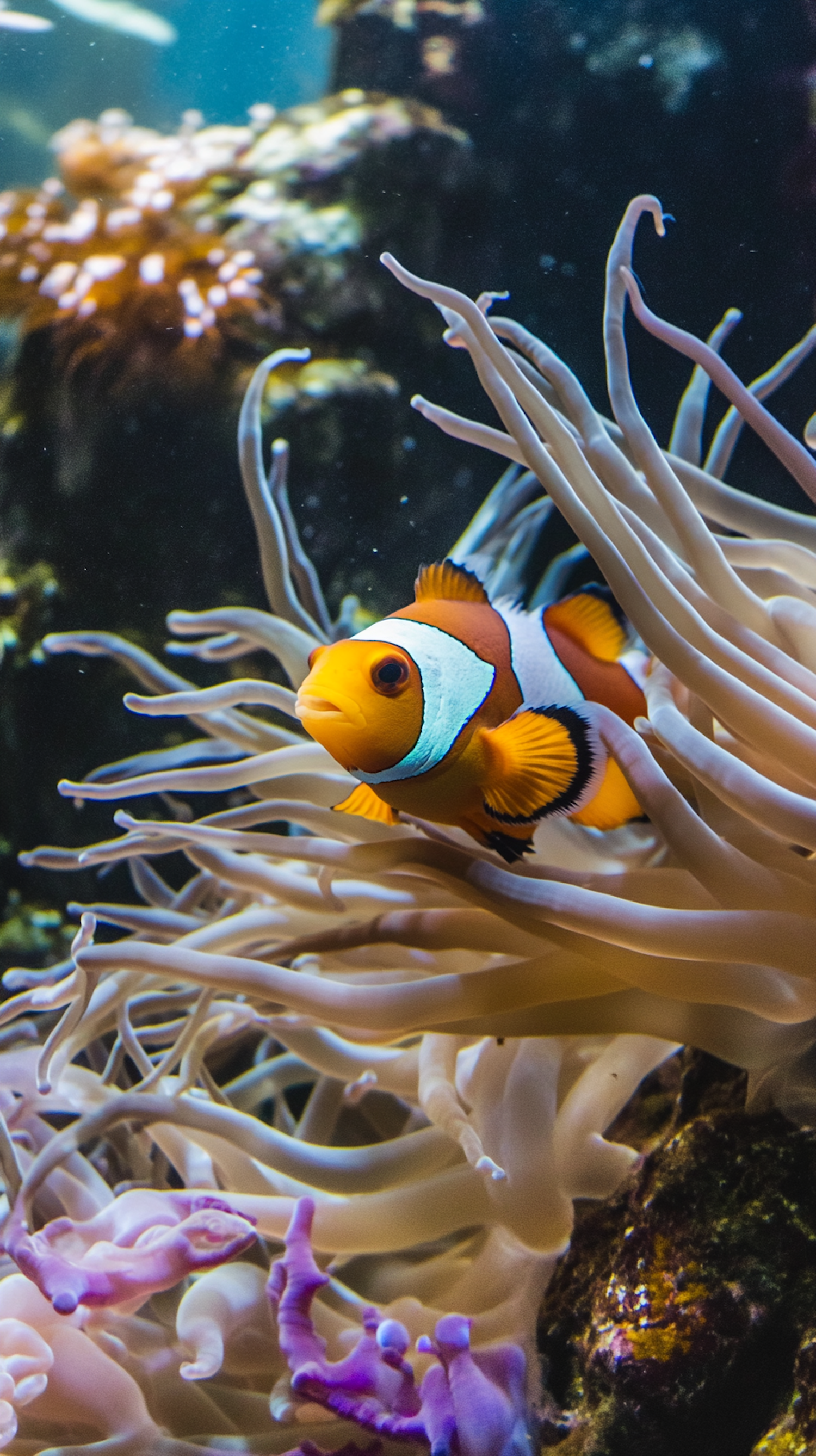 Vibrant clownfish swimming among sea anemone tentacles in a colorful underwater scene.