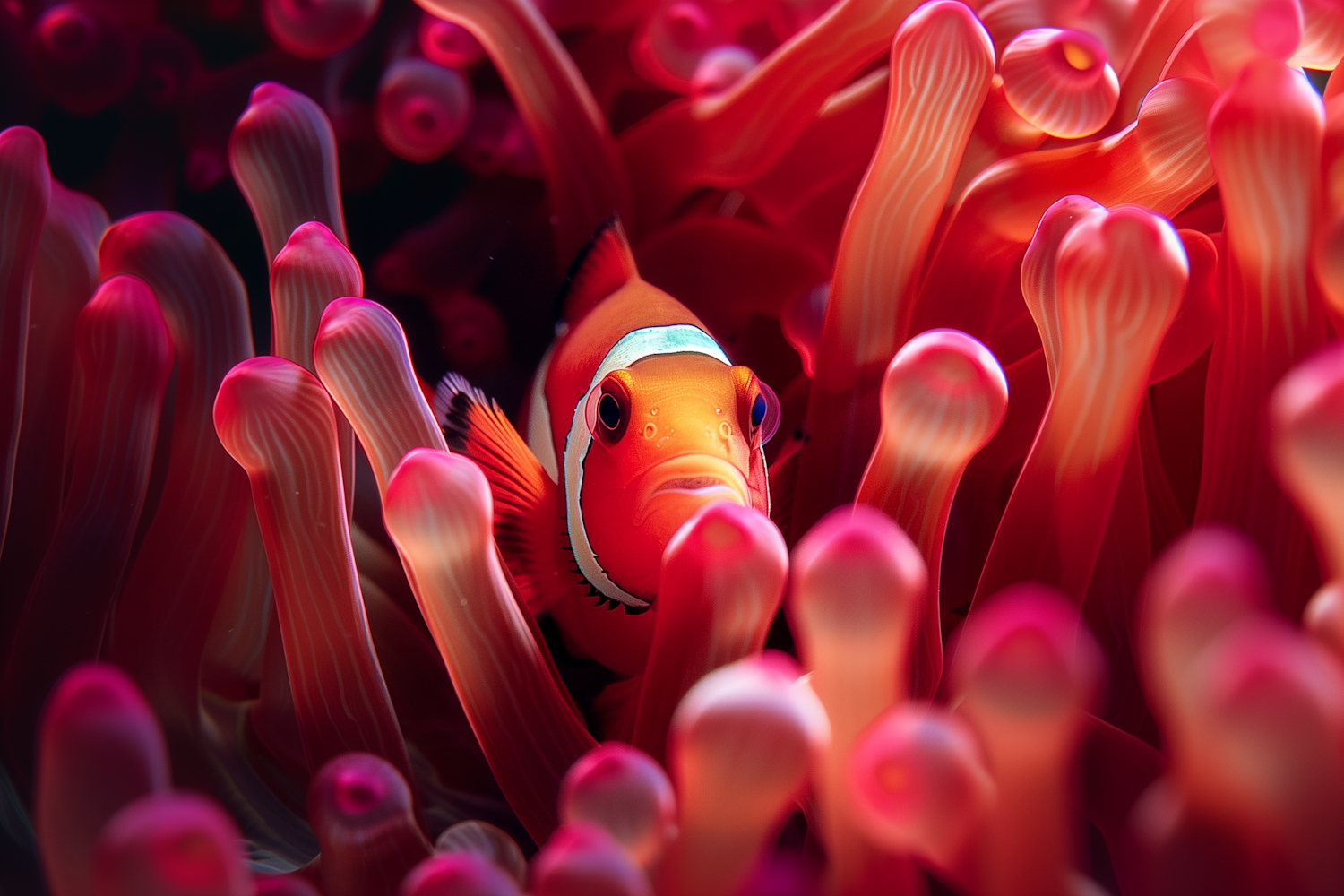A vivid clownfish nestled among pink and red anemone tentacles, showcasing vibrant marine life and striking colors.