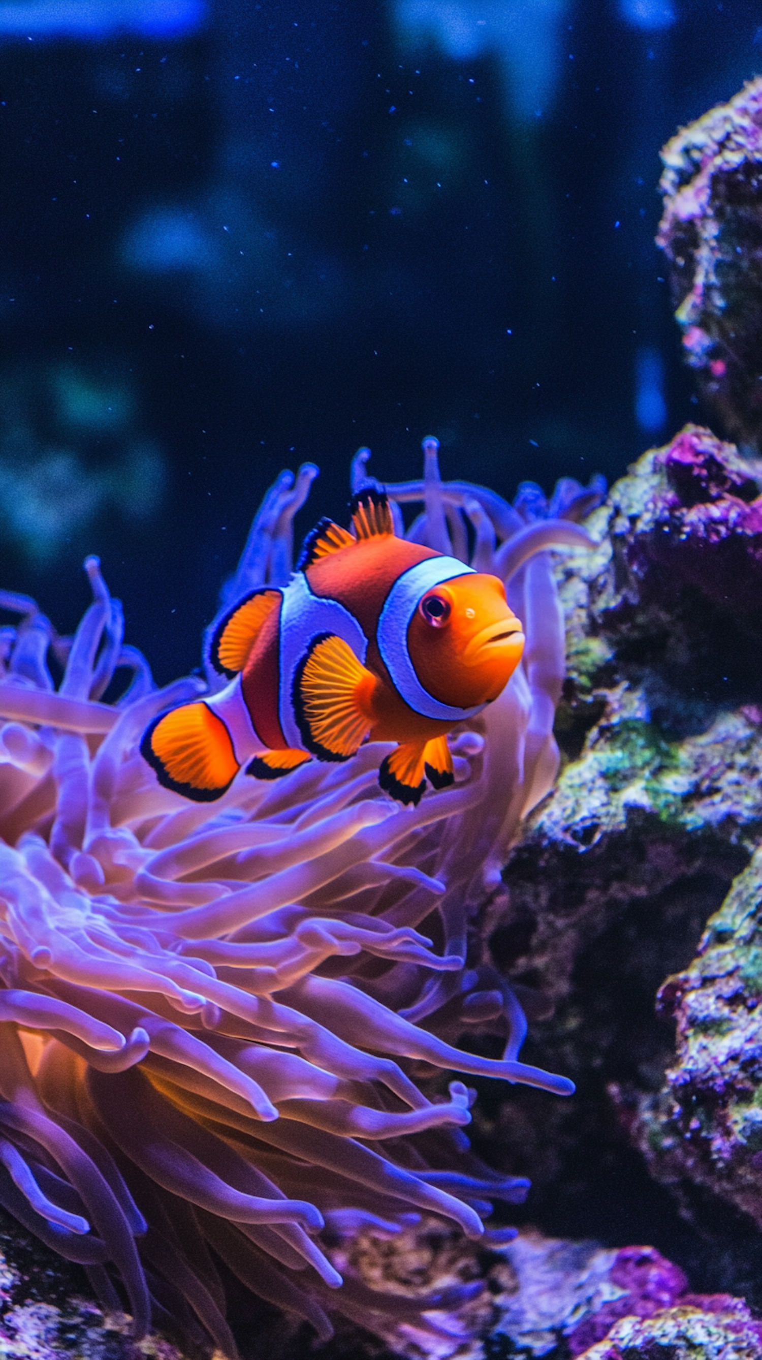Vibrant clownfish swimming near a purple sea anemone in a deep blue underwater setting.