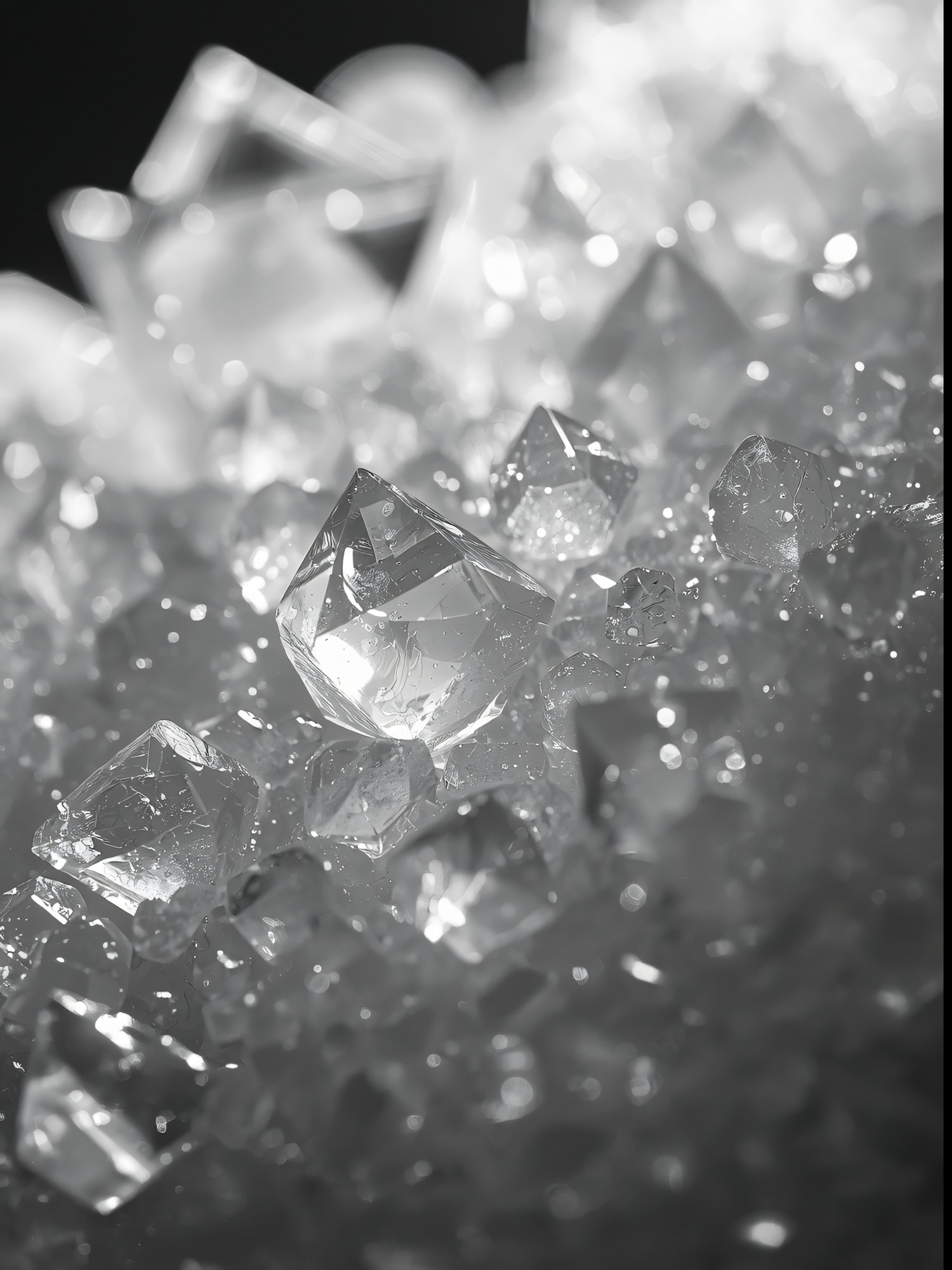 Close-up of sparkling clear crystals with intricate facets, illuminated to highlight their brilliance and sharp edges against a blurred background.