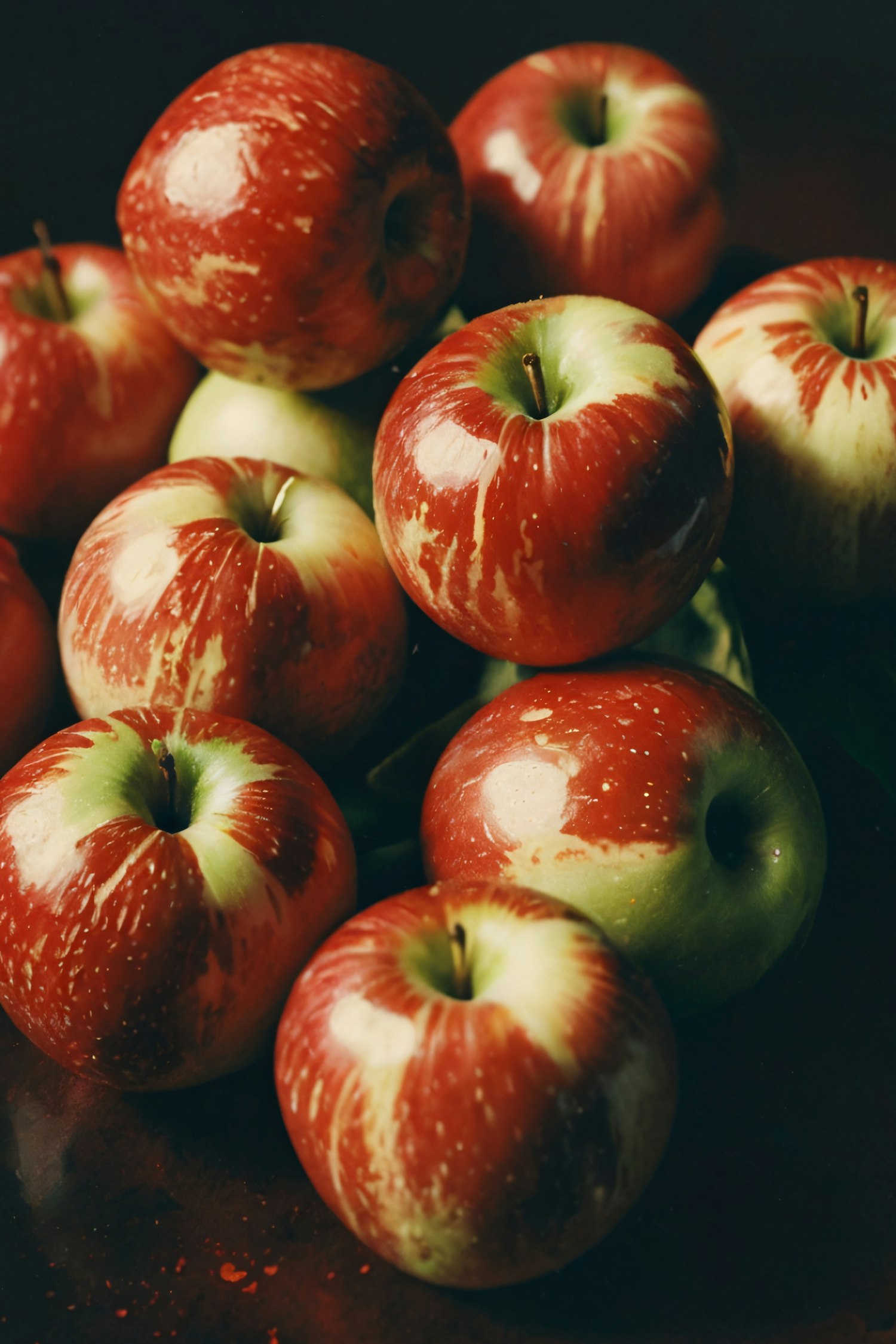 Vibrant red and green apples with glossy skins, arranged in a cluster against a dark background.