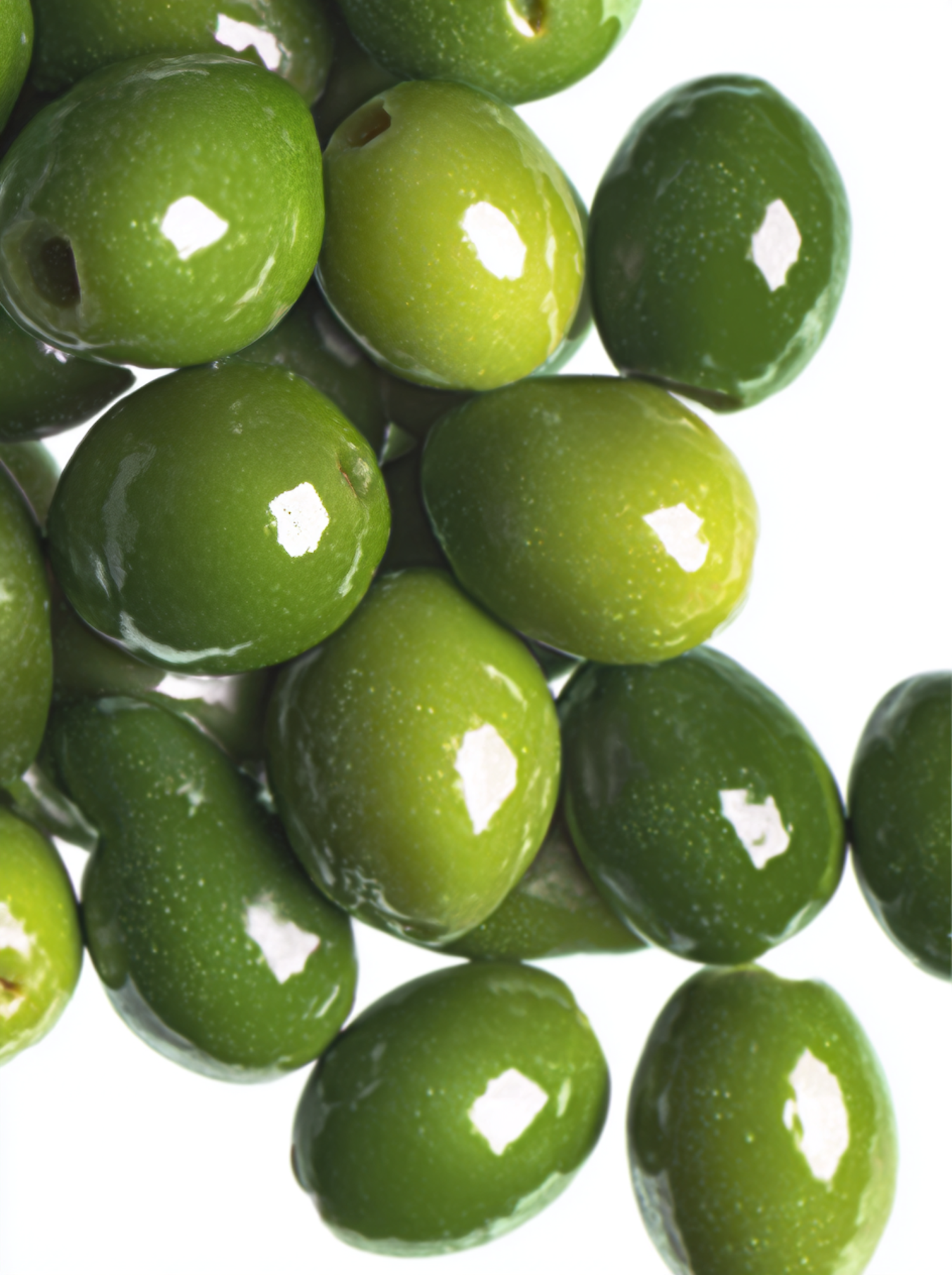 Close-up of fresh green olives with a glossy texture, highlighting their vibrant color and smooth surface against a white background.