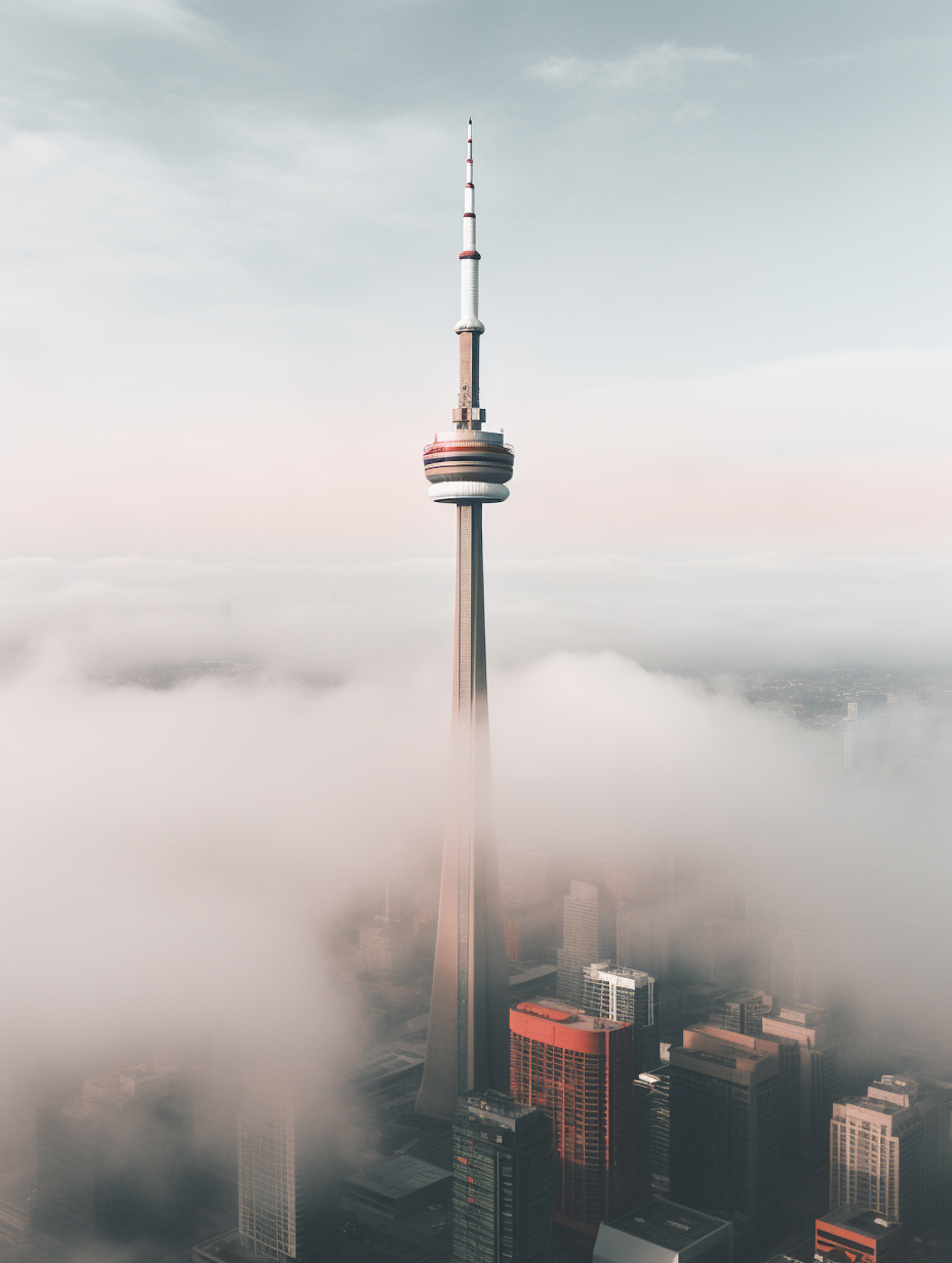 Iconic tower piercing through clouds with skyscrapers below, set against a serene pastel sky. A breathtaking urban skyline view.