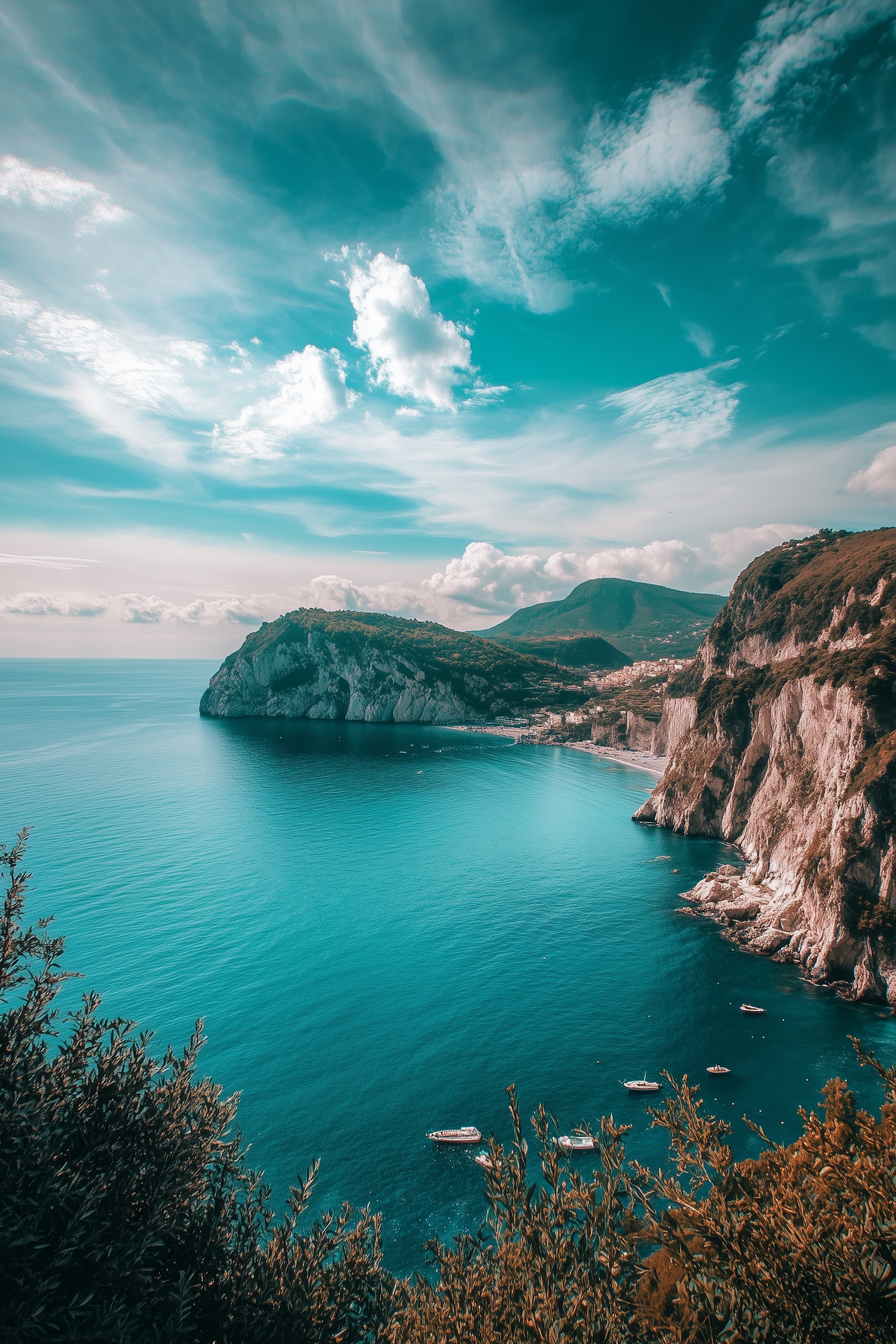 Breathtaking coastal view with turquoise waters, rugged cliffs, small boats, and a serene town nestled in lush green hills.