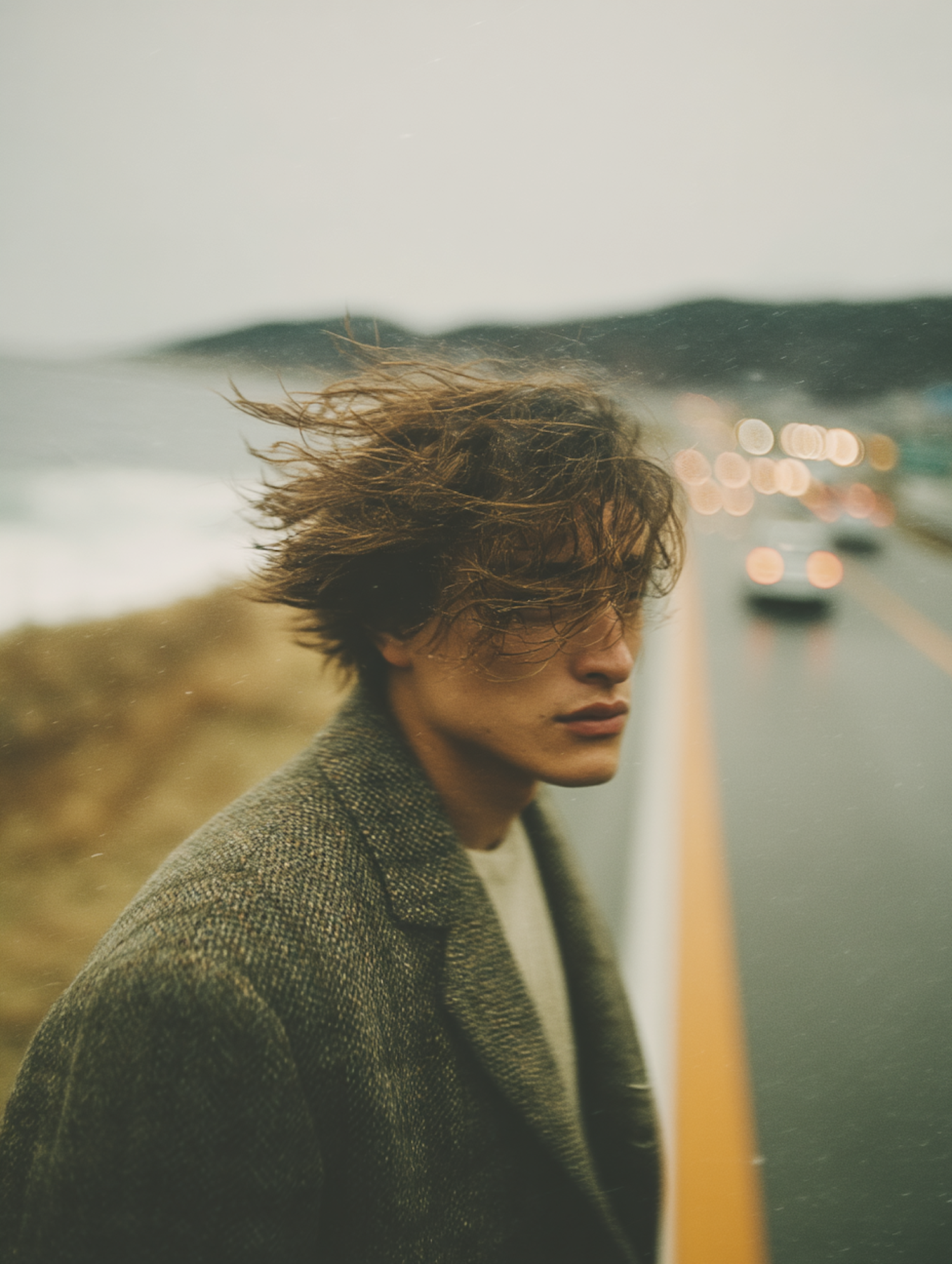 A person with windblown hair stands near a road with blurred car lights, wearing a textured coat against a coastal backdrop.