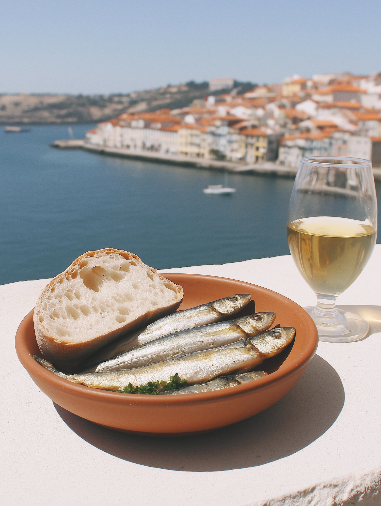 Grilled sardines with bread and wine overlooking a picturesque coastal town and sea view.