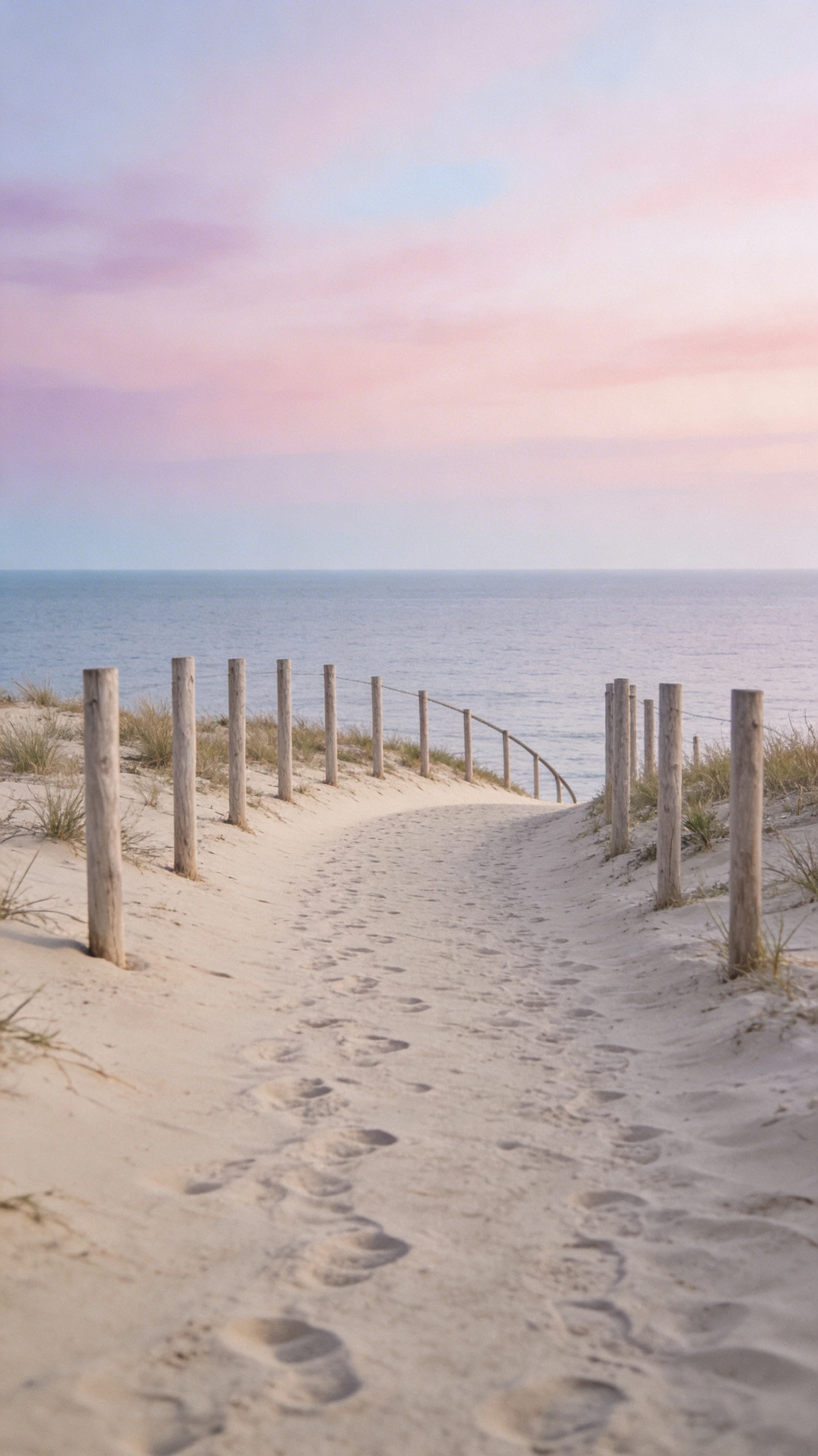 A narrow sandy path lined with simple wooden posts leading to the ocean, soft pastel sky, minimal composition, no text.