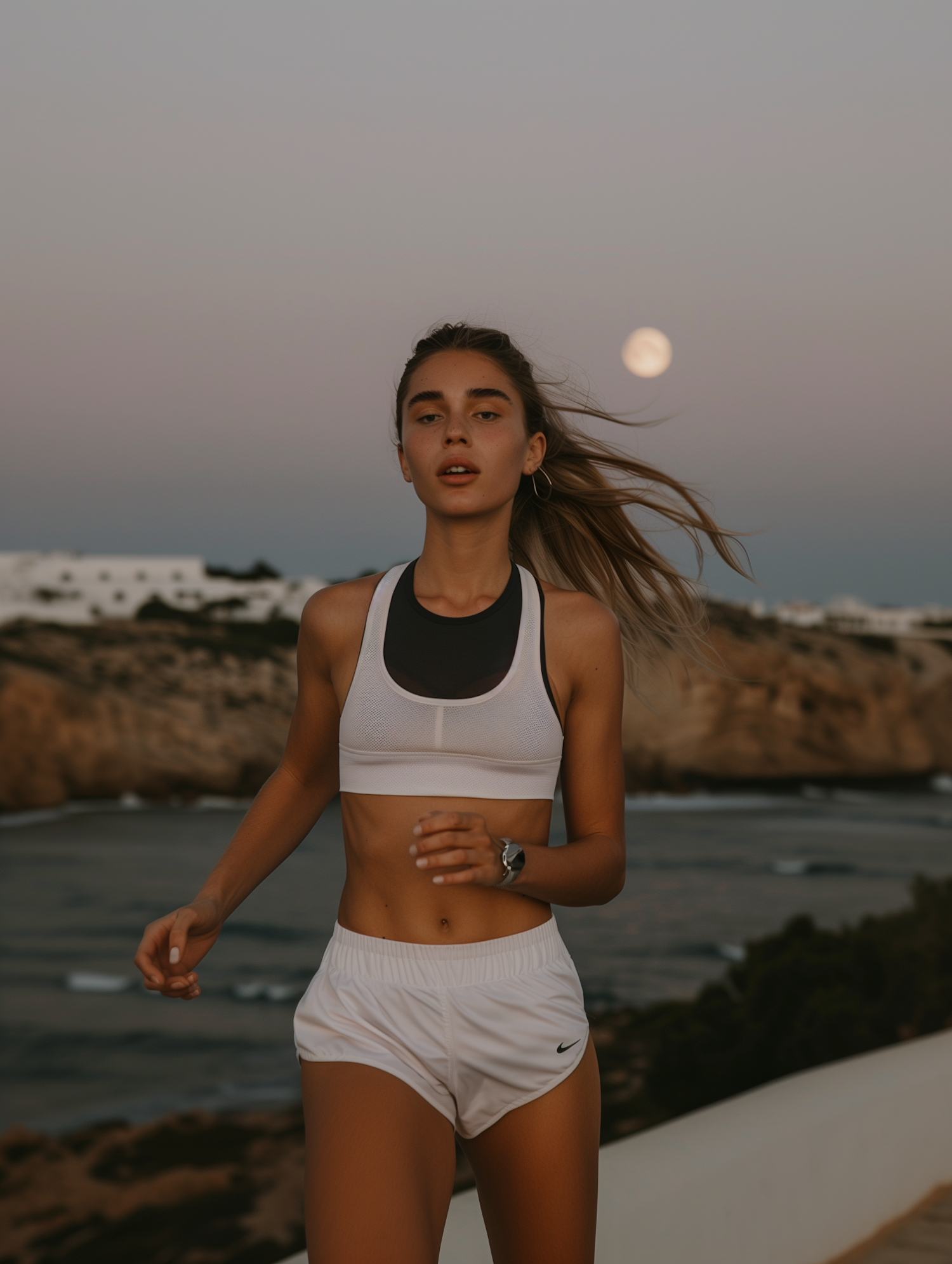Young woman jogging by the coast at dusk, wearing white sportswear, with a full moon in the background.
