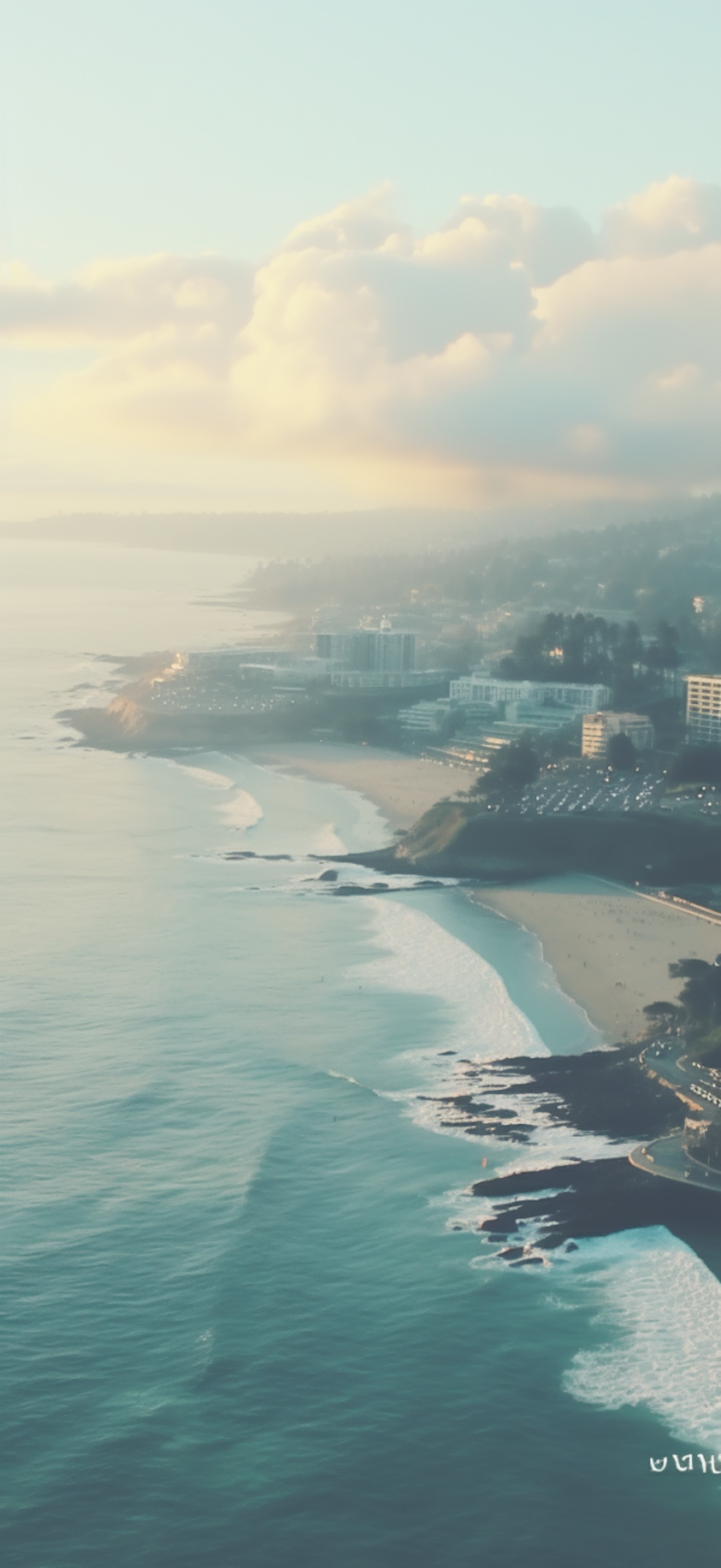 A tranquil coastal view with gentle waves, rocky shoreline, and a distant cityscape under a soft, cloud-filled sky.