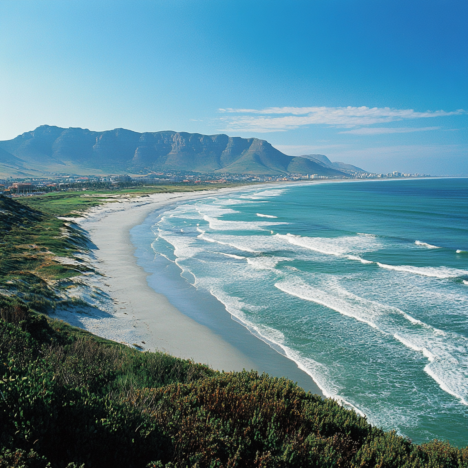 Scenic coastal view with turquoise ocean, sandy beach, and majestic mountains under a clear blue sky.