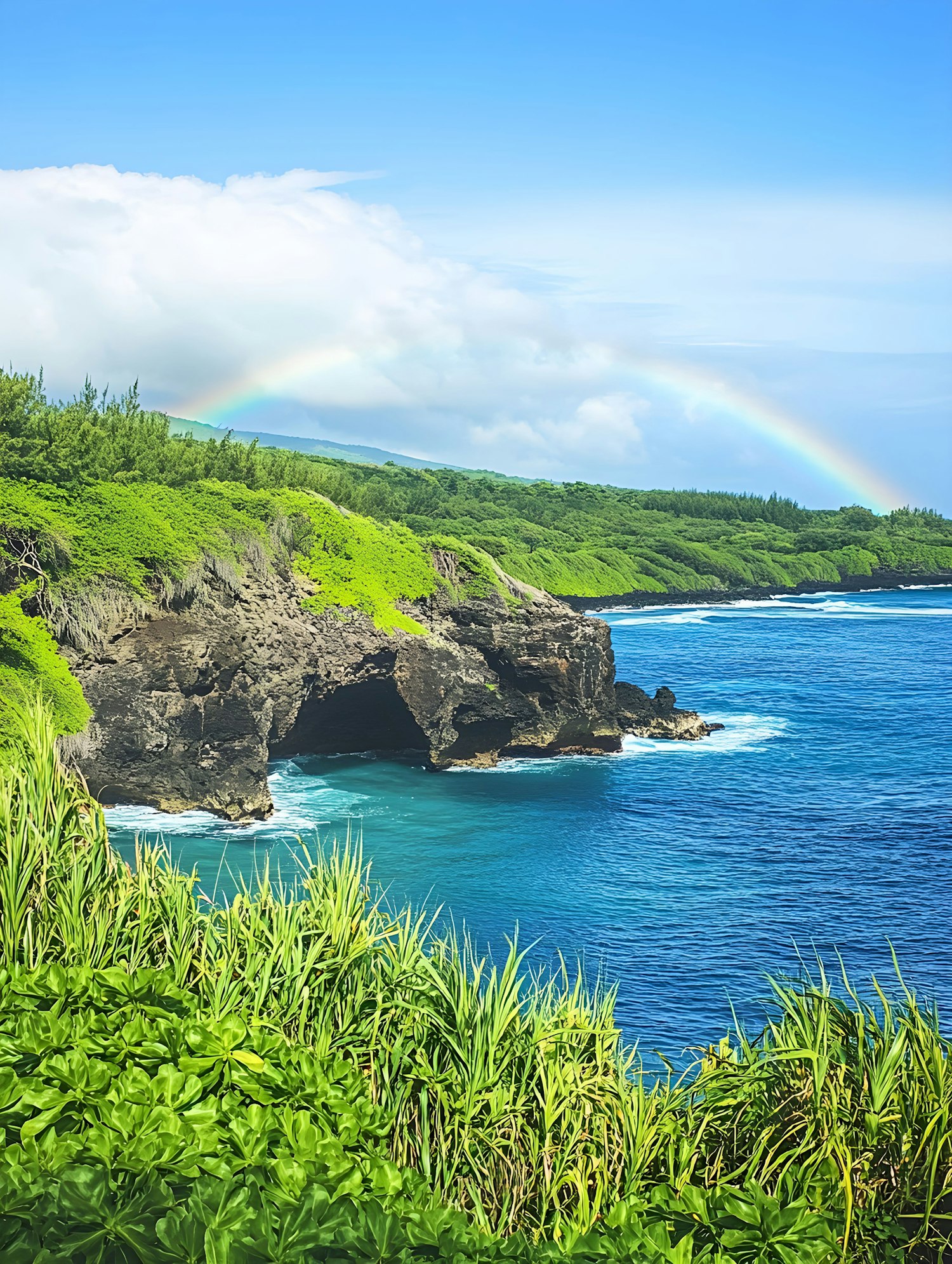 Vibrant coastal scene with green cliffs, blue ocean, and a rainbow in the sky. Perfect blend of nature's beauty and tranquility.