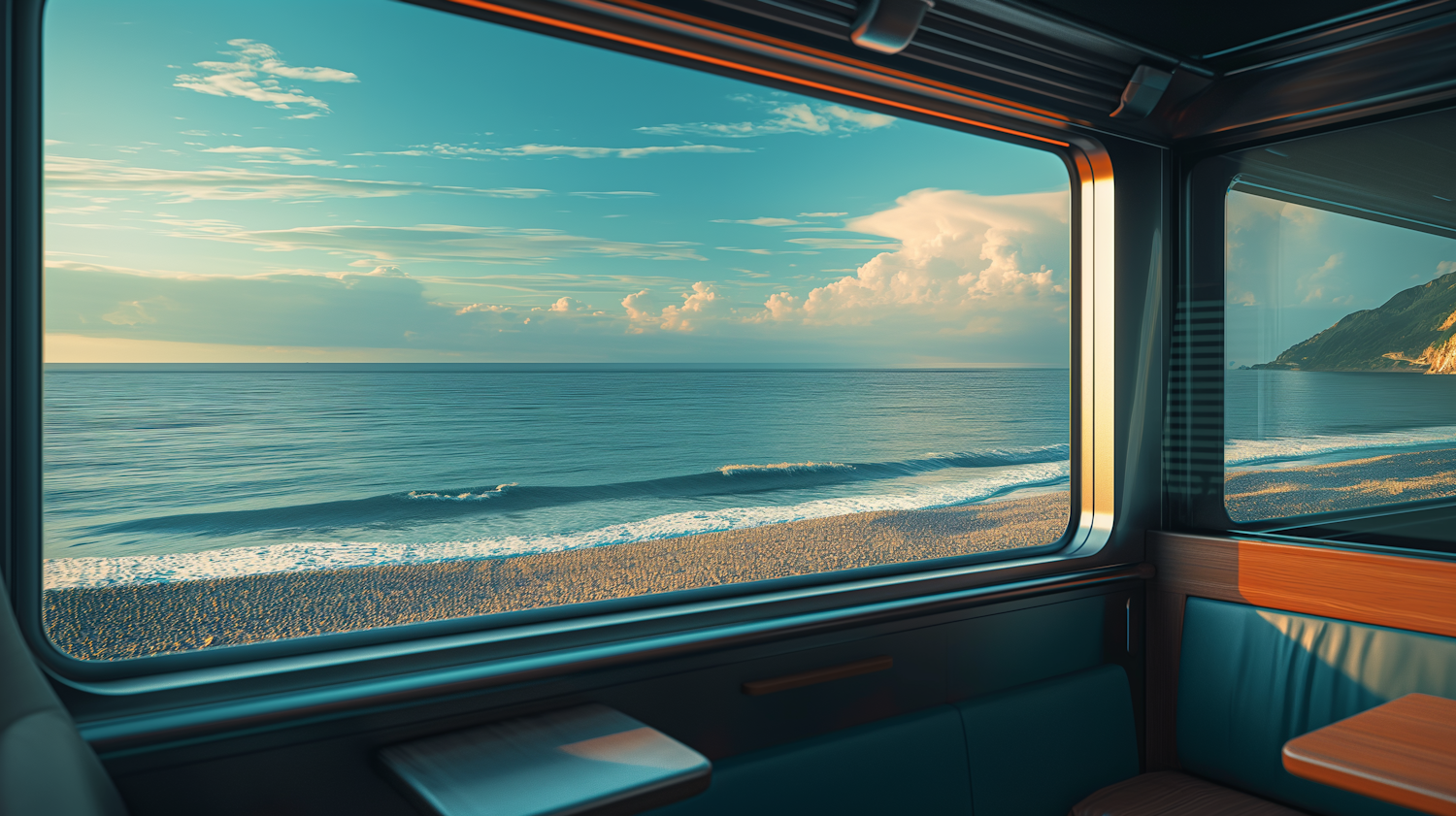 Scenic ocean view from a train window, capturing waves, a pebbled beach, and a vibrant sky with fluffy clouds.