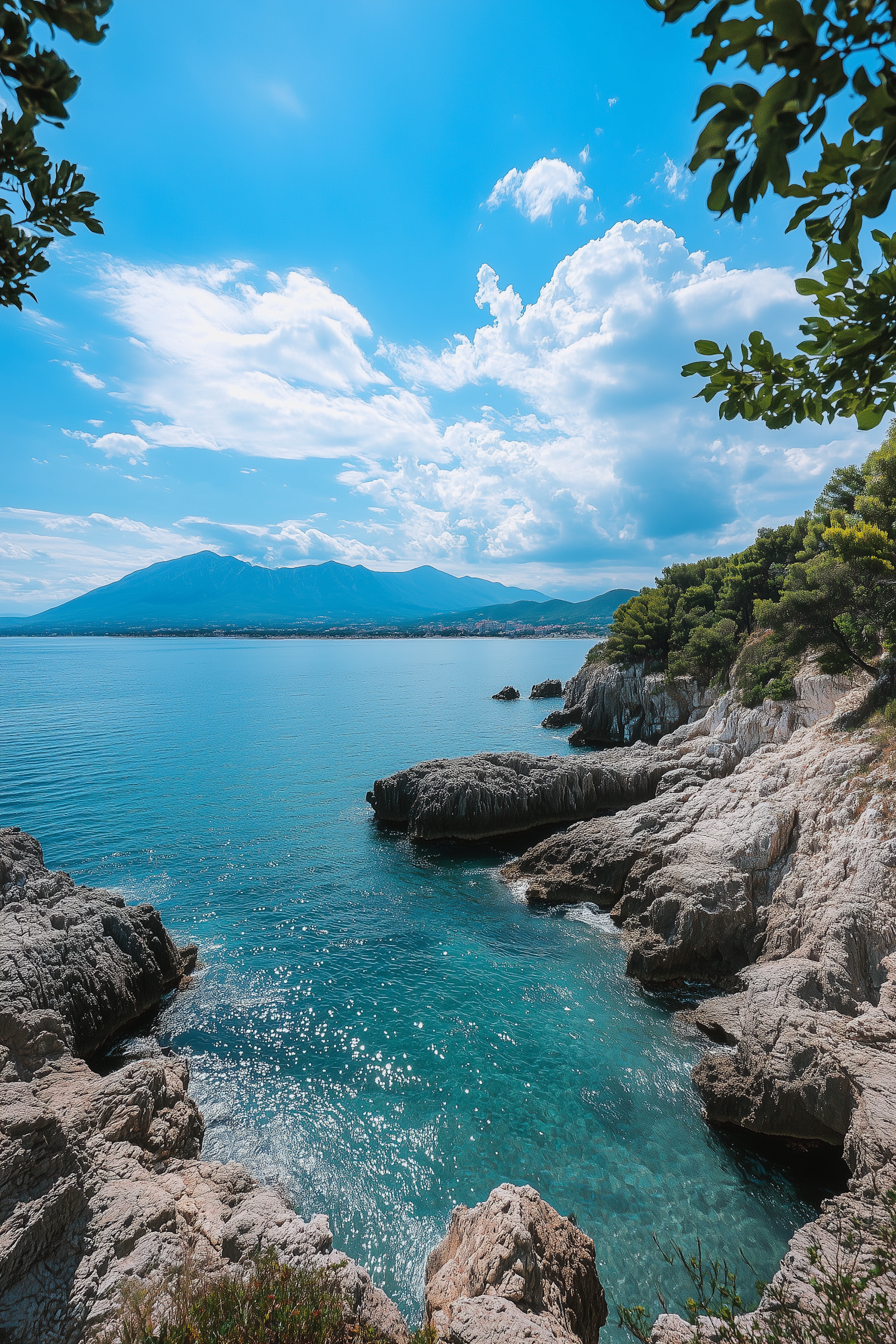 Breathtaking coastal view with turquoise waters, rugged cliffs, and distant mountains under a vibrant blue sky with fluffy clouds.