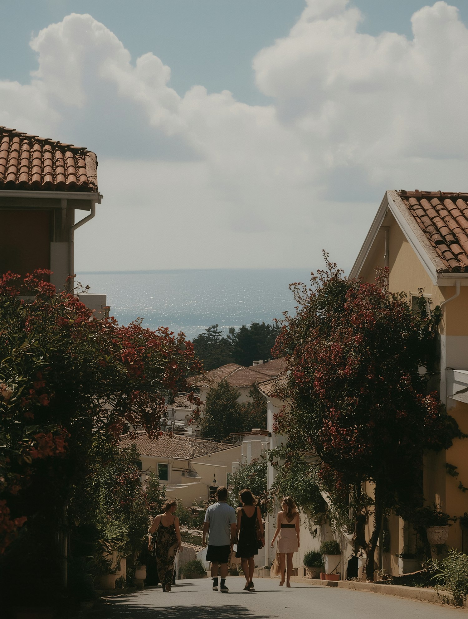 A serene coastal street with charming houses, lush greenery, and a group of people strolling towards the sparkling sea.