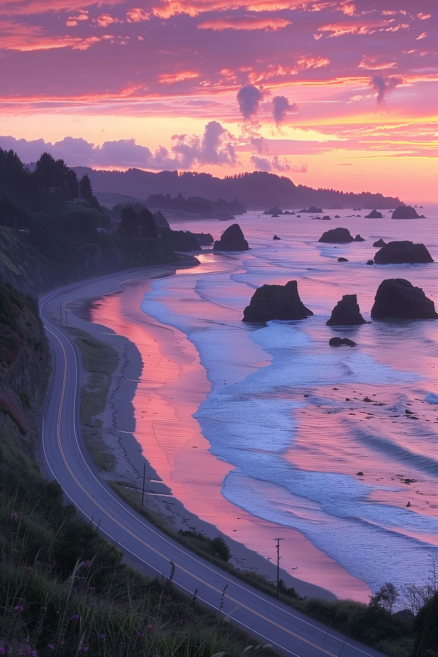 Stunning coastal sunset with vibrant skies, ocean waves, and rock formations along a winding road. Serene and picturesque view.