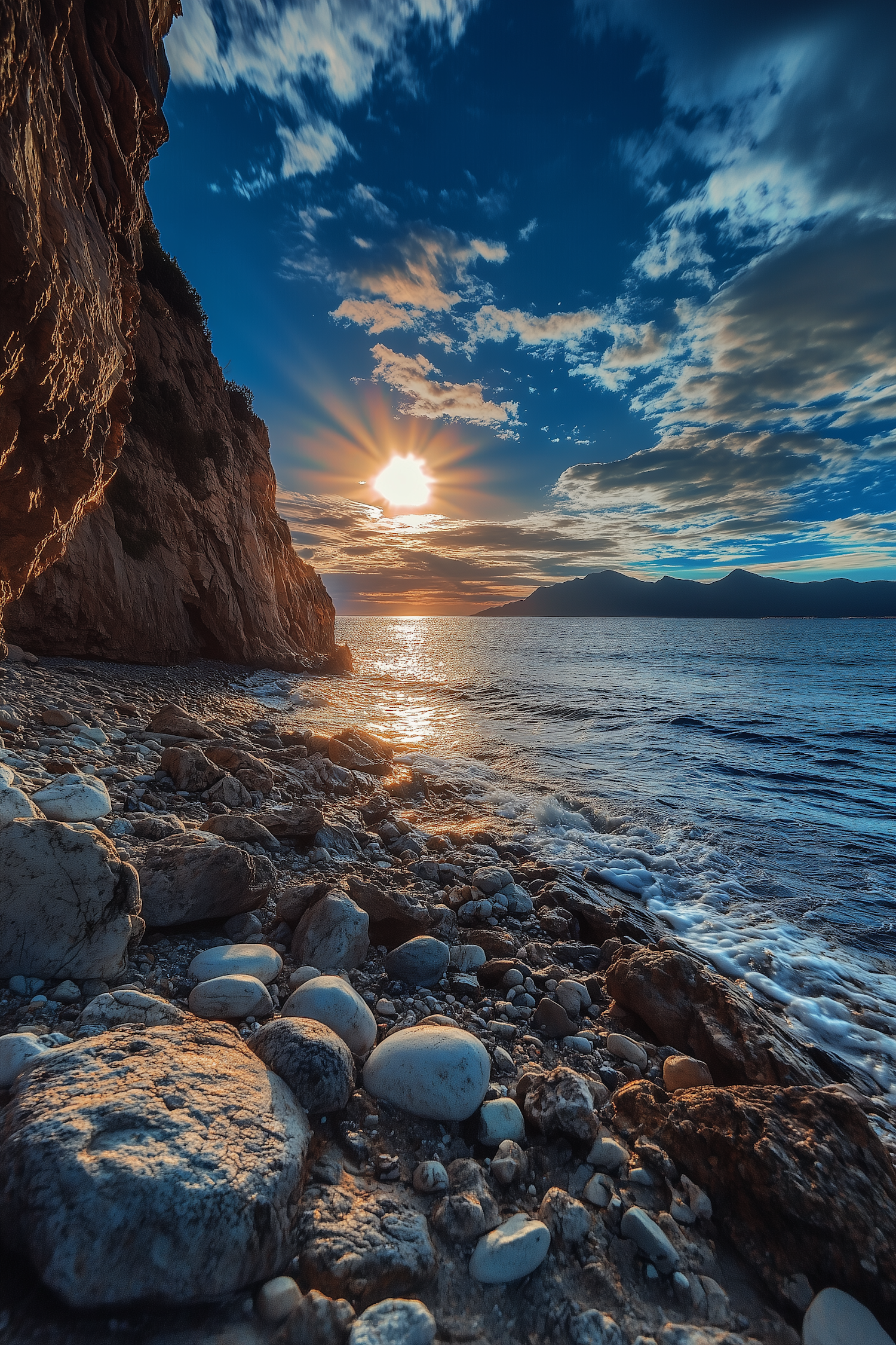 Sunset over a rocky shoreline with golden reflections on the sea and distant mountains under a vibrant sky.