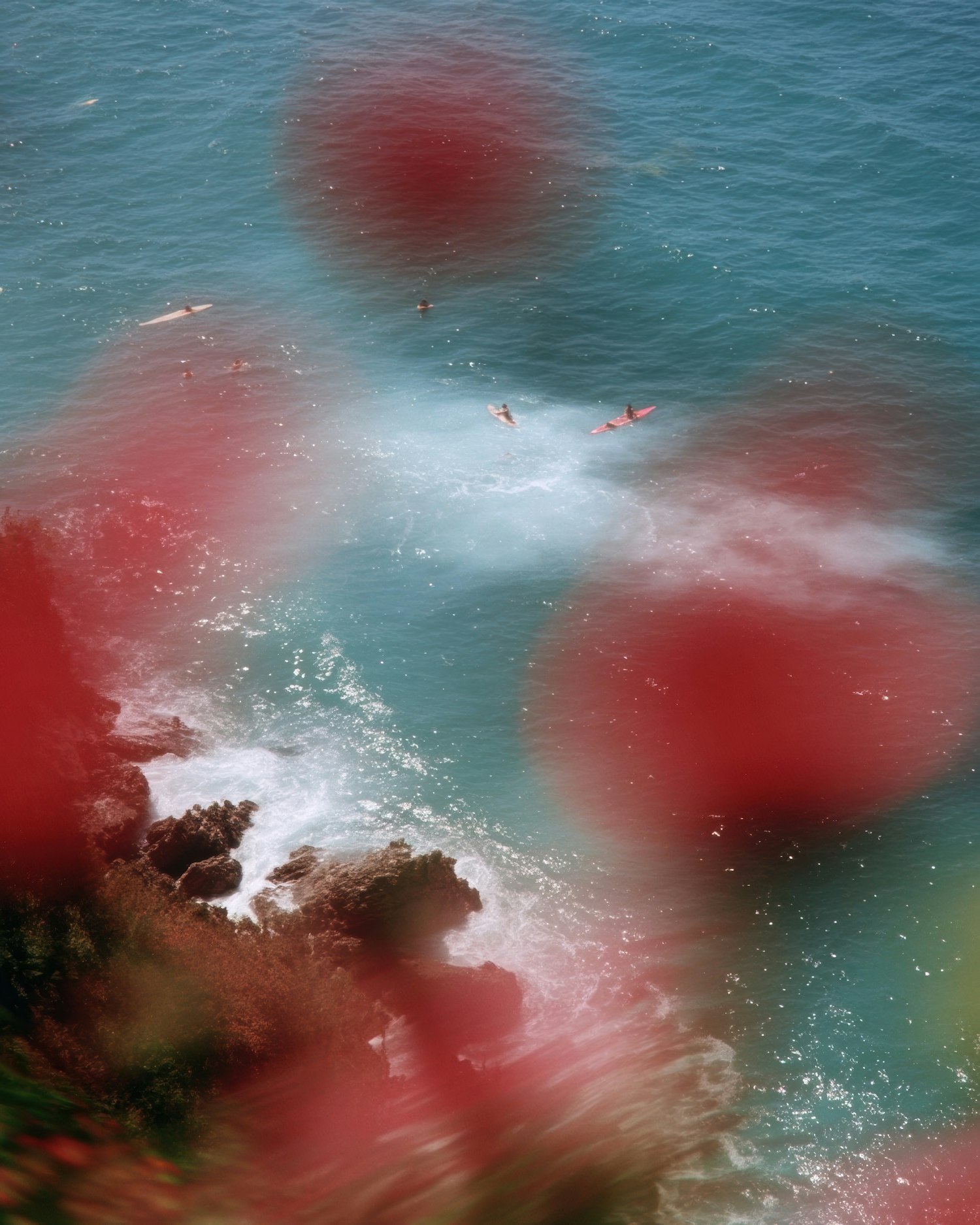 Dreamy coastal view with surfers in turquoise waters, rugged cliffs, and blurred red flowers in the foreground.