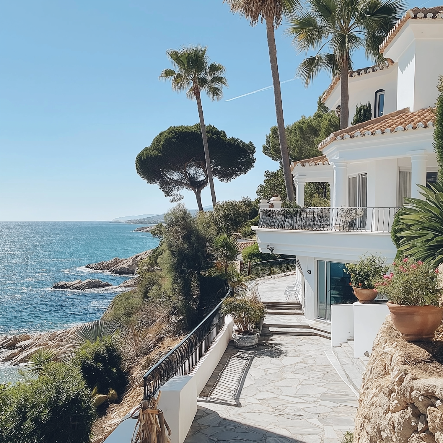 Luxurious white villa on a cliff with ocean views, surrounded by palm trees and lush greenery, under a clear blue sky.