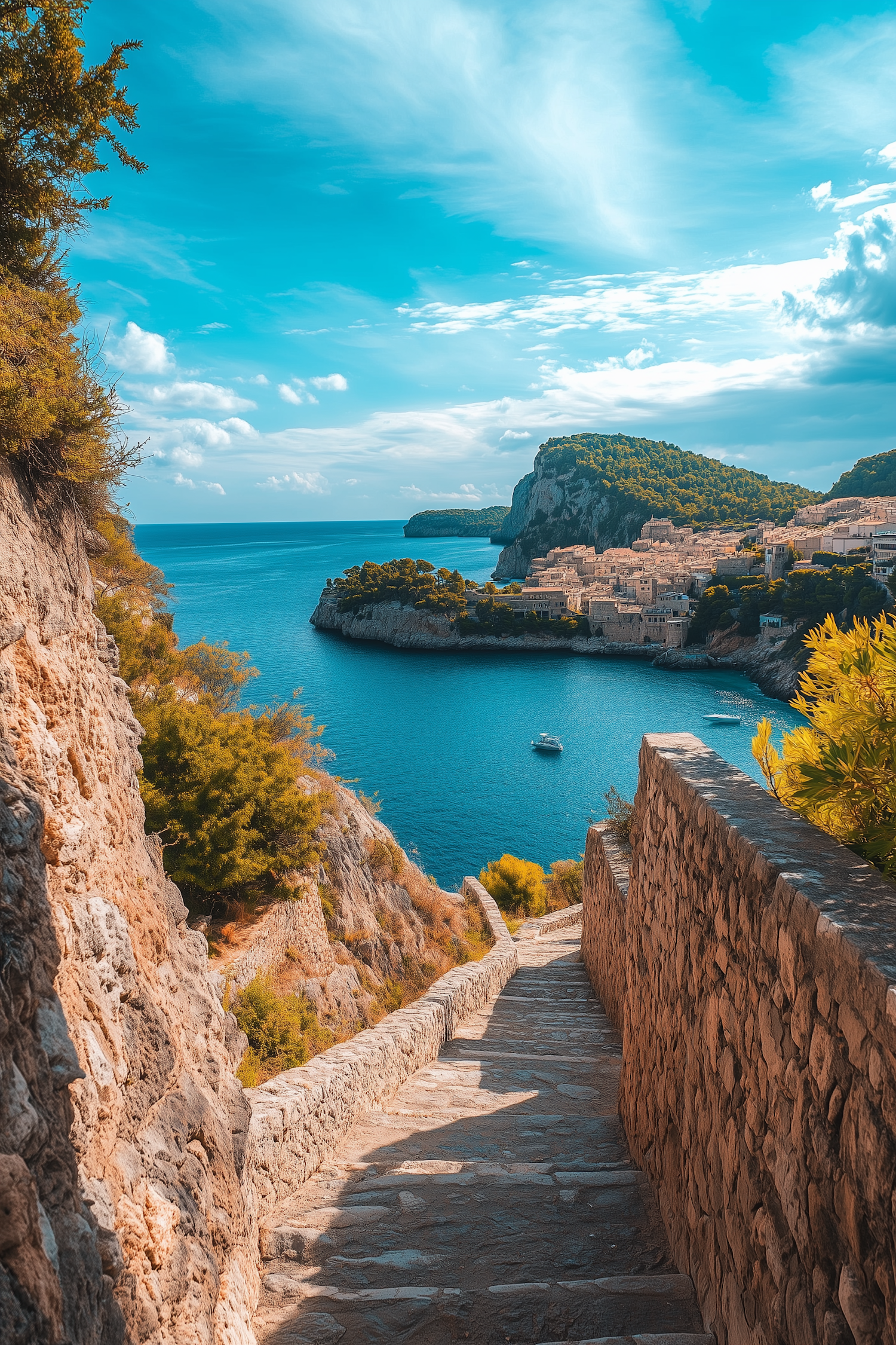 Stone stairs lead to a coastal village by a turquoise bay, surrounded by cliffs and lush greenery under a bright blue sky.