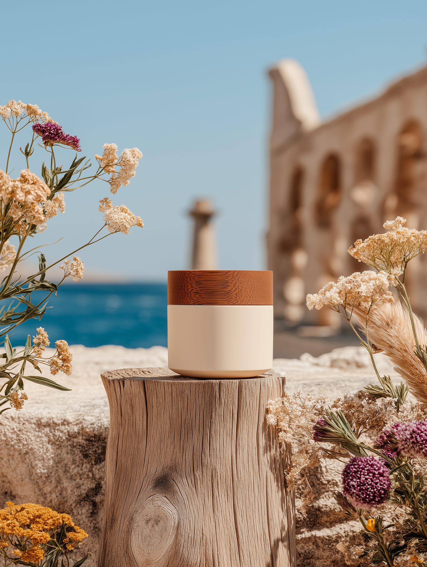 A stylish container on a wooden stump surrounded by colorful wildflowers, with a coastal backdrop featuring a lighthouse and ruins.