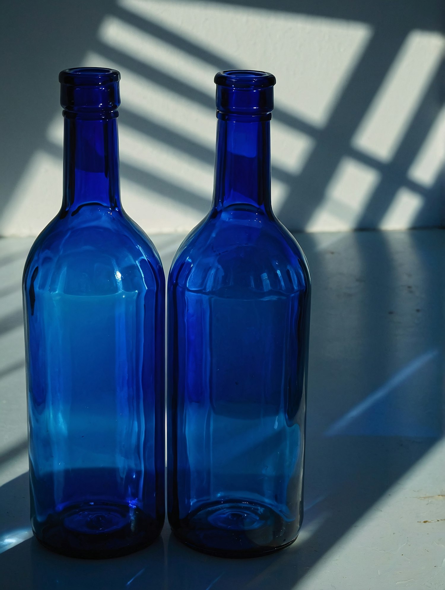 Two cobalt blue glass bottles on a light surface, with dramatic shadows from sunlight streaming through a window. Minimalist aesthetic.