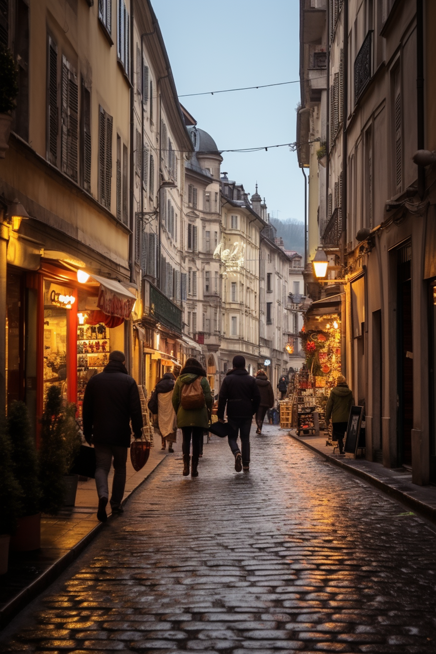 Charming European street with cobblestones, historic buildings, and warm shop lights. People stroll in winter attire under an overcast sky.
