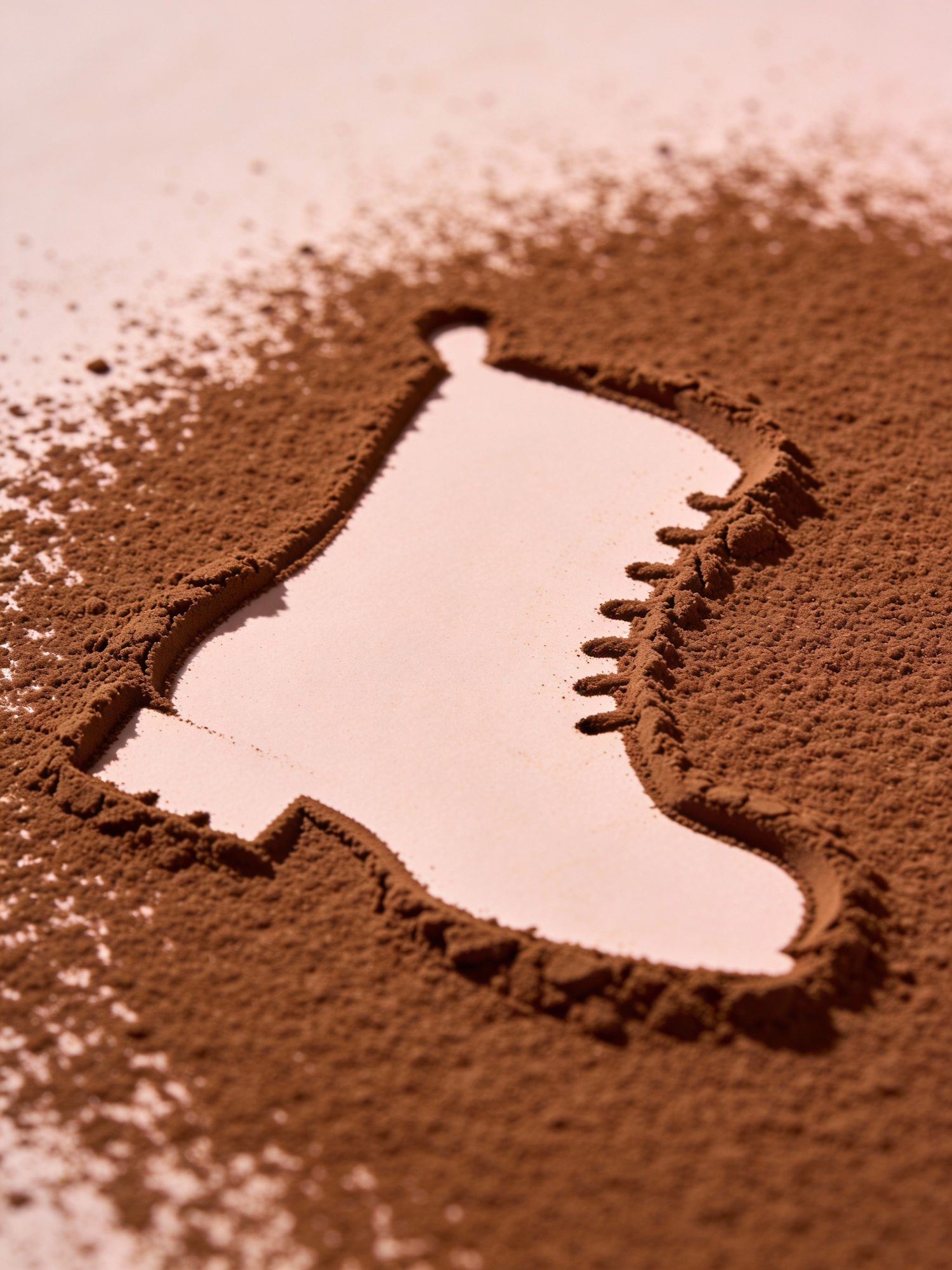 Close-up of cocoa powder that forms a boot print on a smooth pastal surface, showcasing its texture and natural beauty in a minimalistic style.