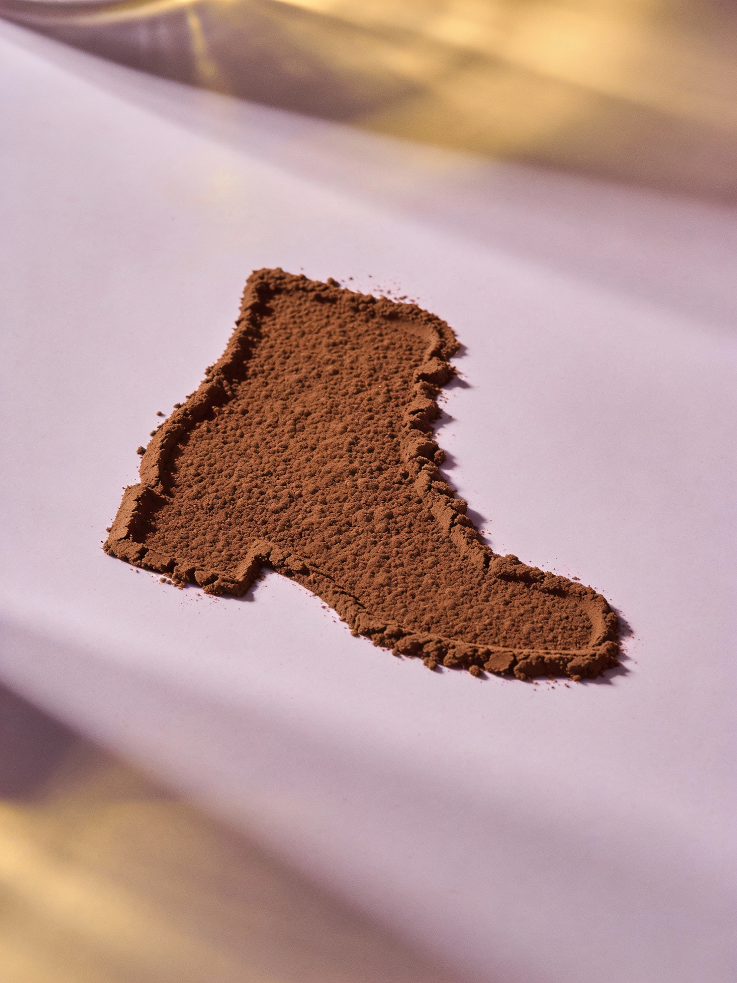 A boot silhouette made of cocoa powder on a smooth surface, with soft lighting and shadows creating a minimalist artistic composition.