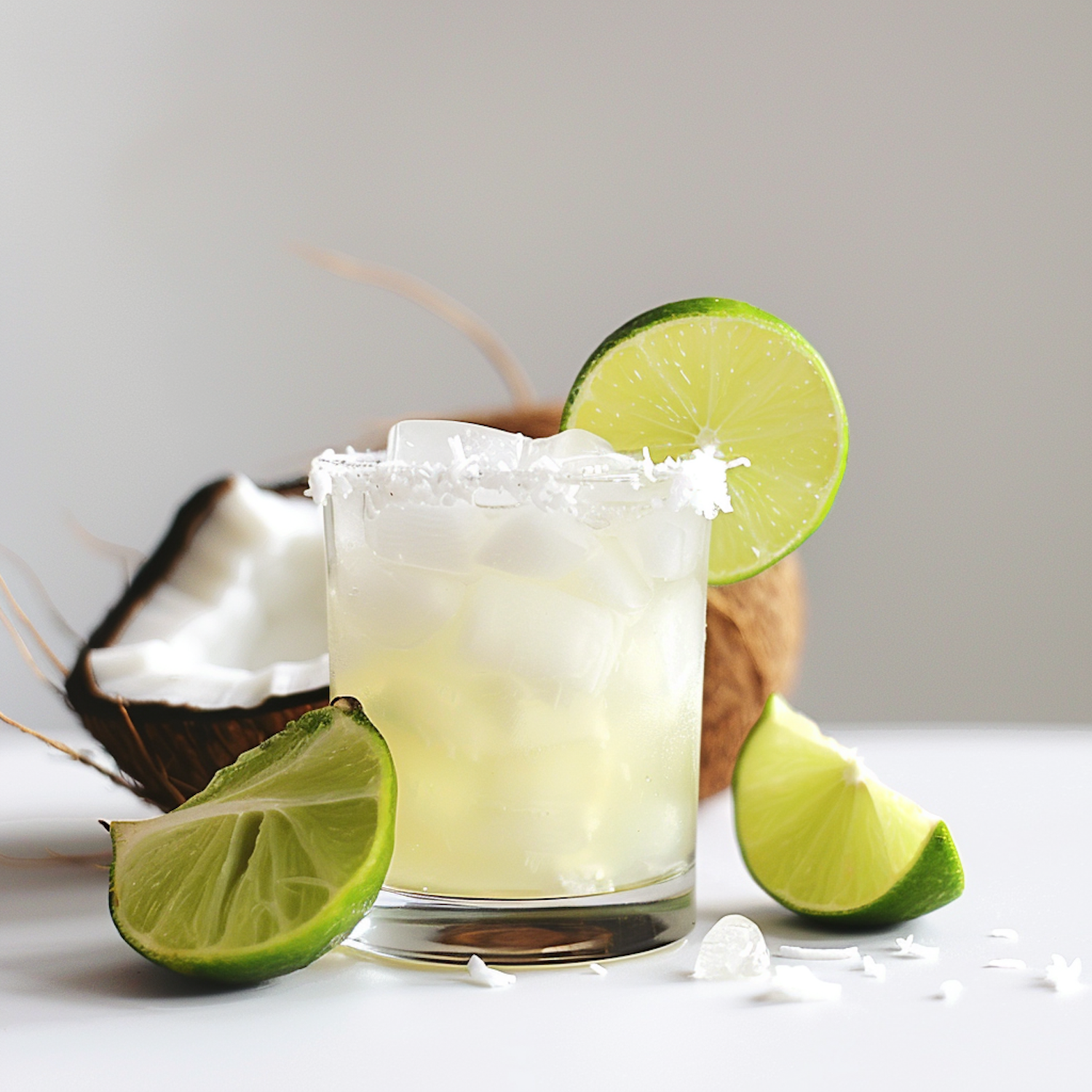 Refreshing cocktail with lime and coconut, served in a salt-rimmed glass with ice. Perfect for a tropical vibe.