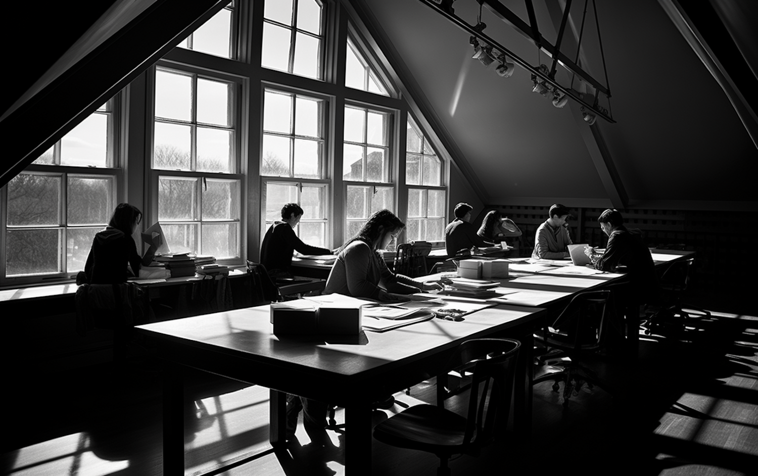 People studying in a sunlit room with large windows, creating a serene and focused atmosphere.