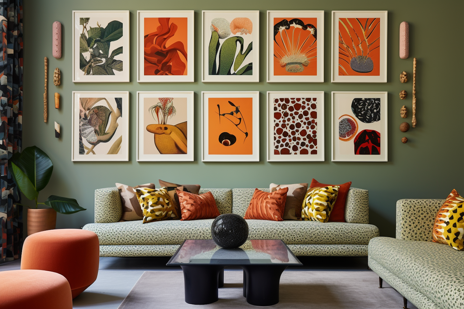 Stylish living room with vibrant art, green sofa, orange accents, and modern decor. Perfect blend of color and texture.