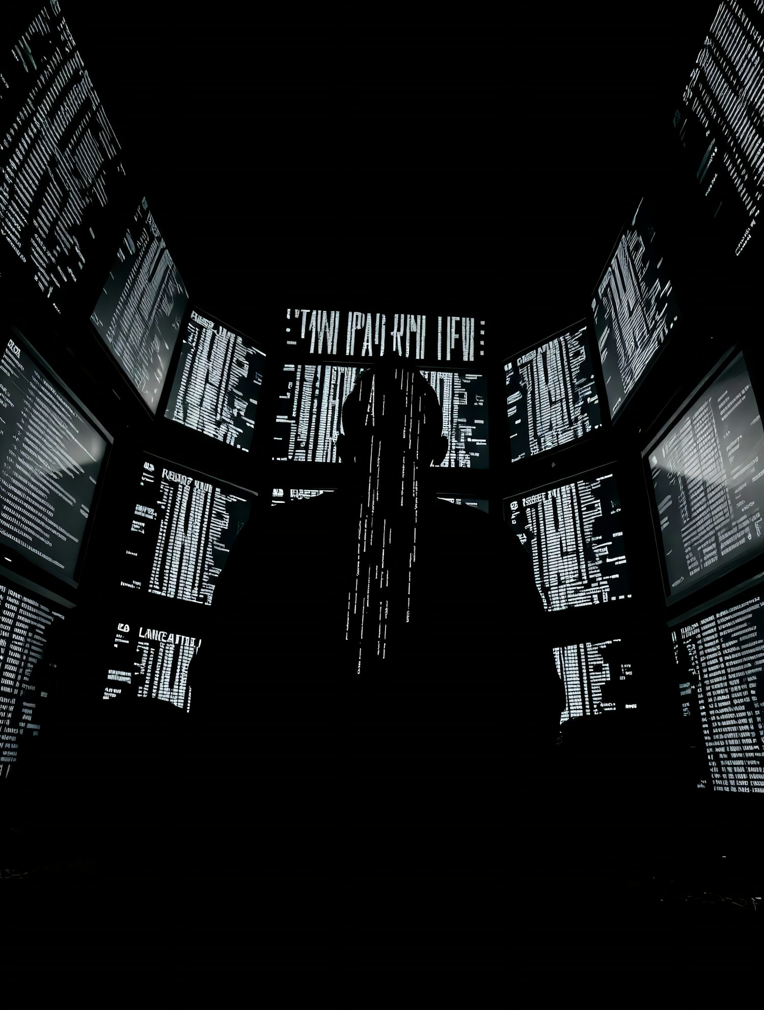 A silhouetted figure in a dark room surrounded by glowing computer screens displaying code, evoking a high-tech and mysterious atmosphere.