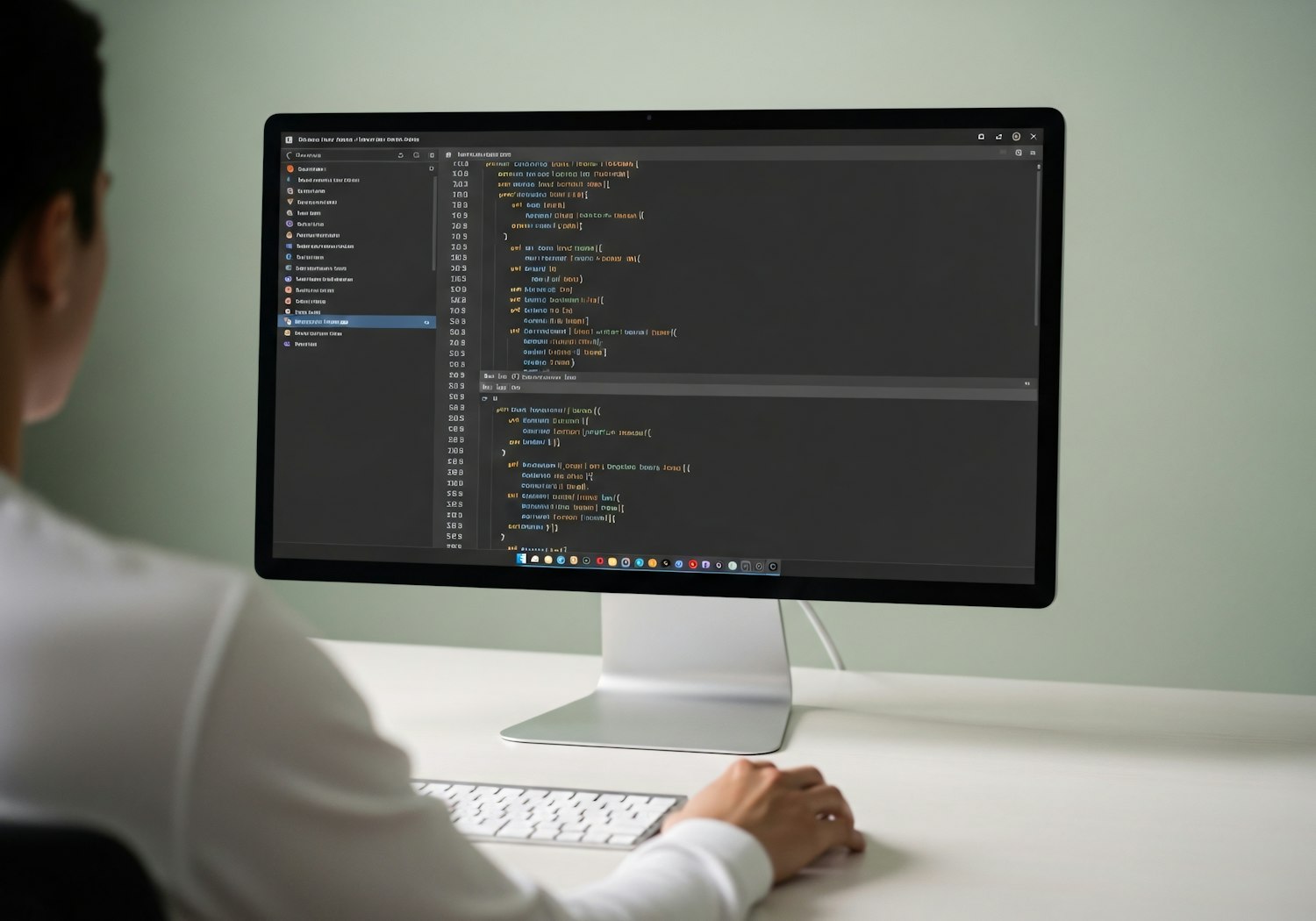 A person coding on a computer with a dark-themed code editor, focusing on programming in a clean and minimalistic workspace.