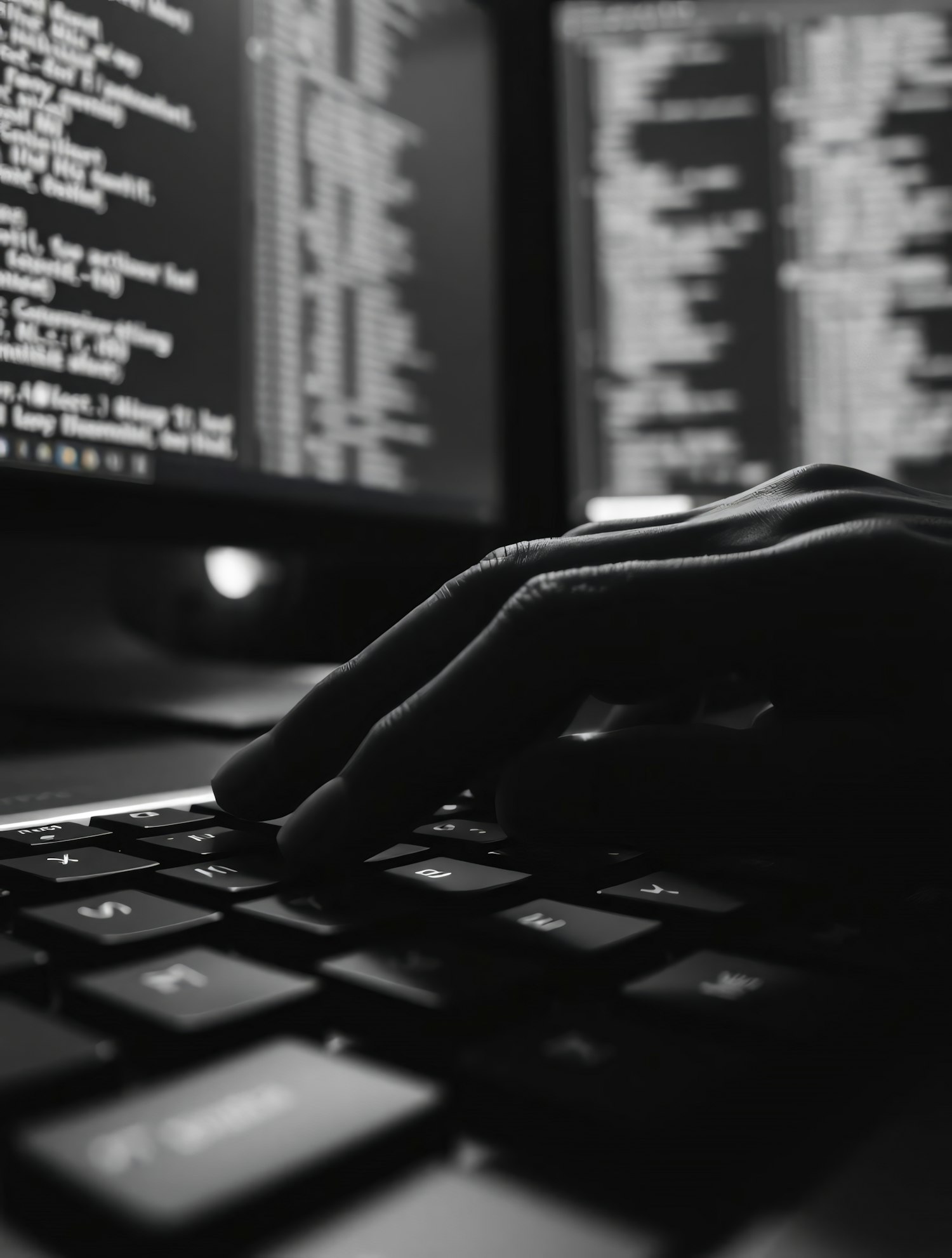 A black-and-white close-up of a hand typing on a keyboard, with computer screens displaying code in the background.