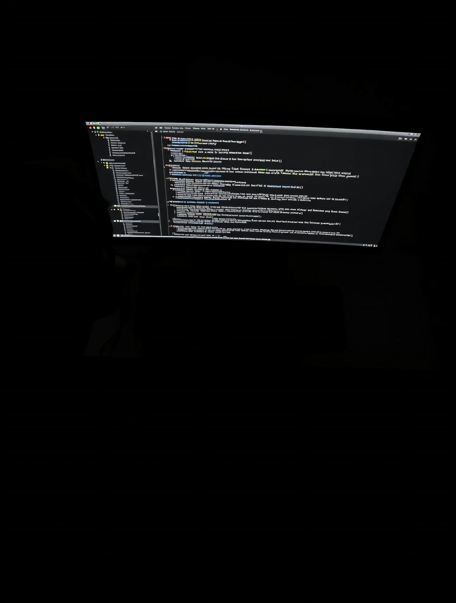 A dark-themed code editor displayed on a monitor in a dimly lit environment, showcasing programming code with syntax highlighting.