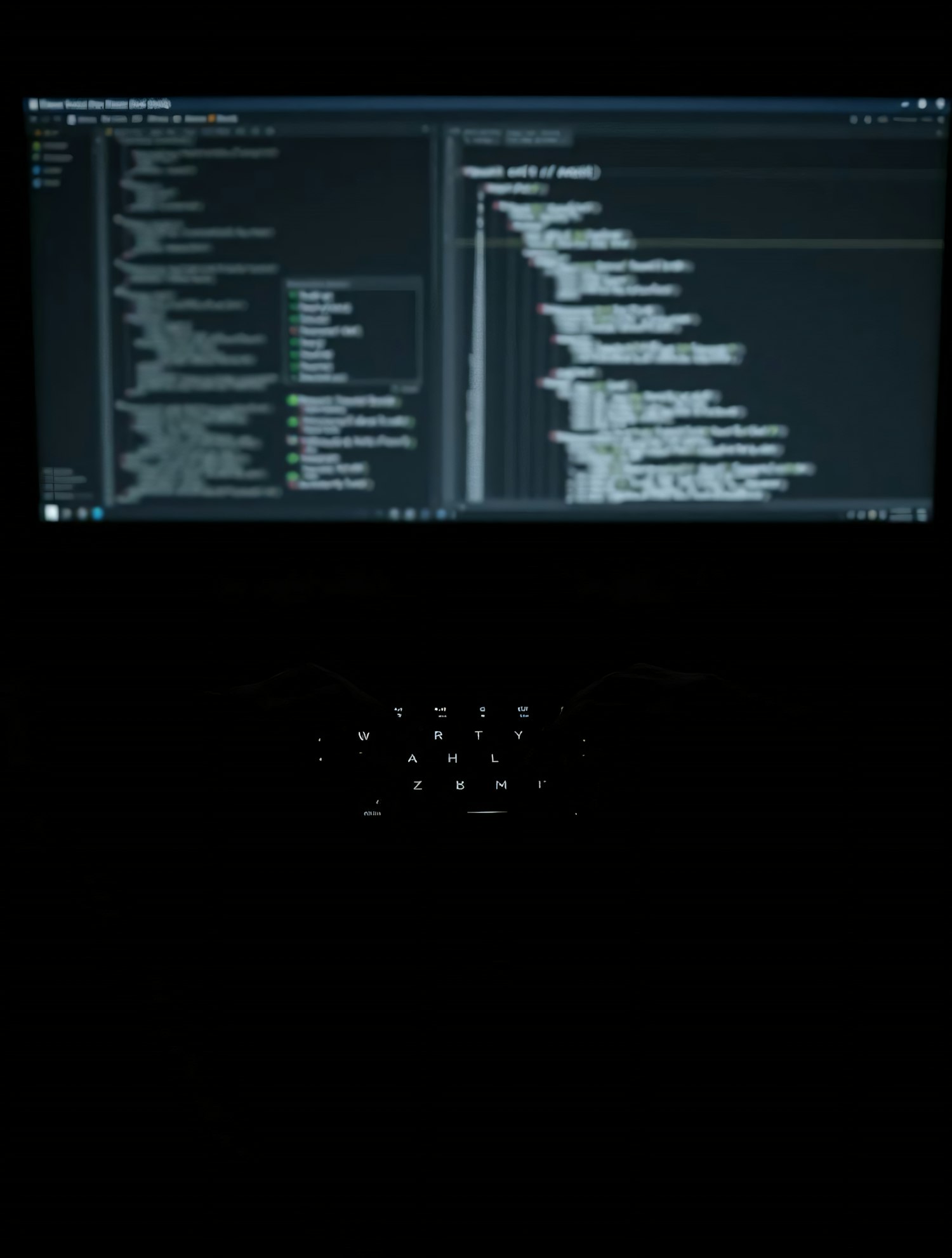 A dark workspace with a glowing screen displaying code and a backlit keyboard, creating a focused programming environment.