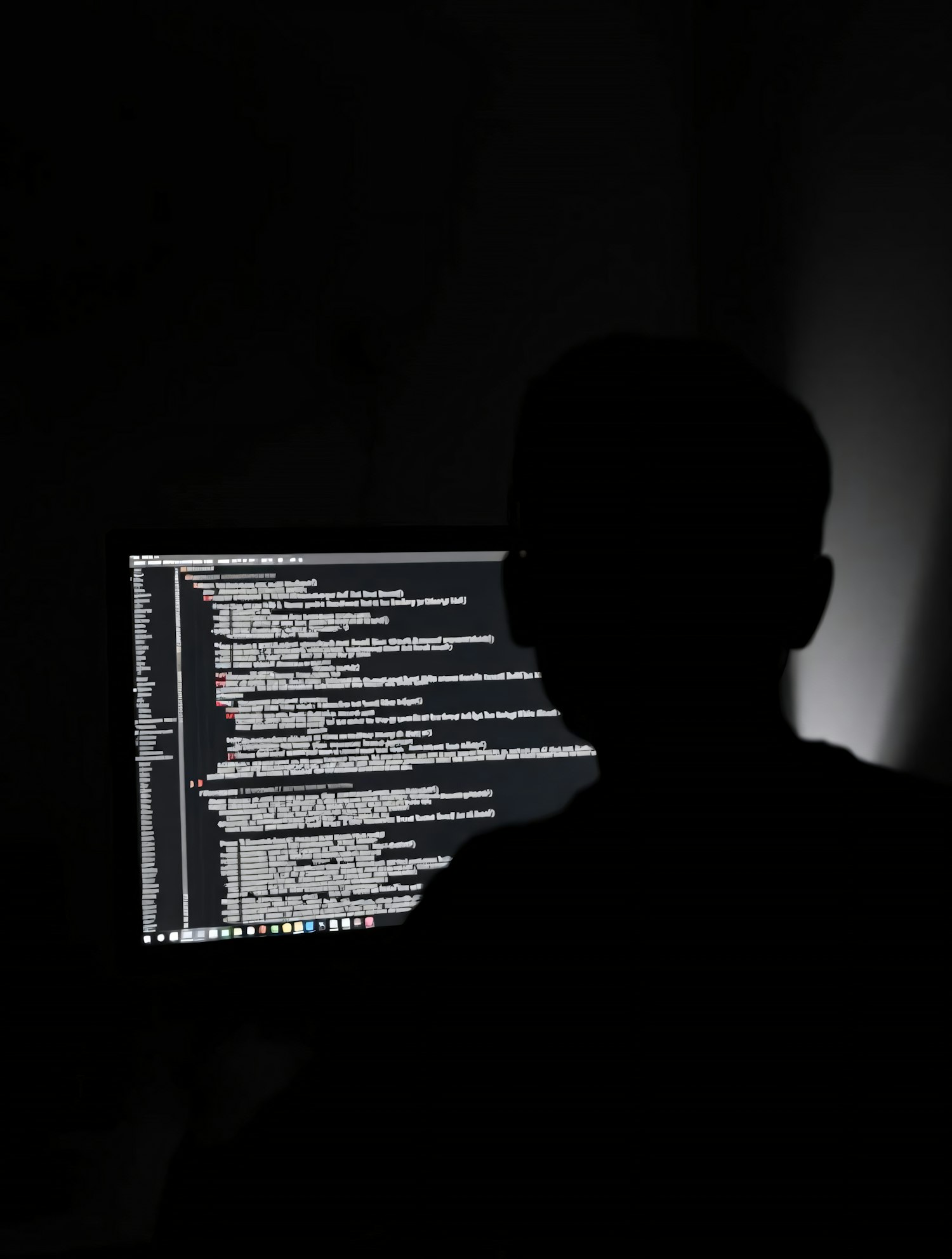 A silhouette of a person coding on a computer in a dimly lit room, with the screen displaying lines of programming code.