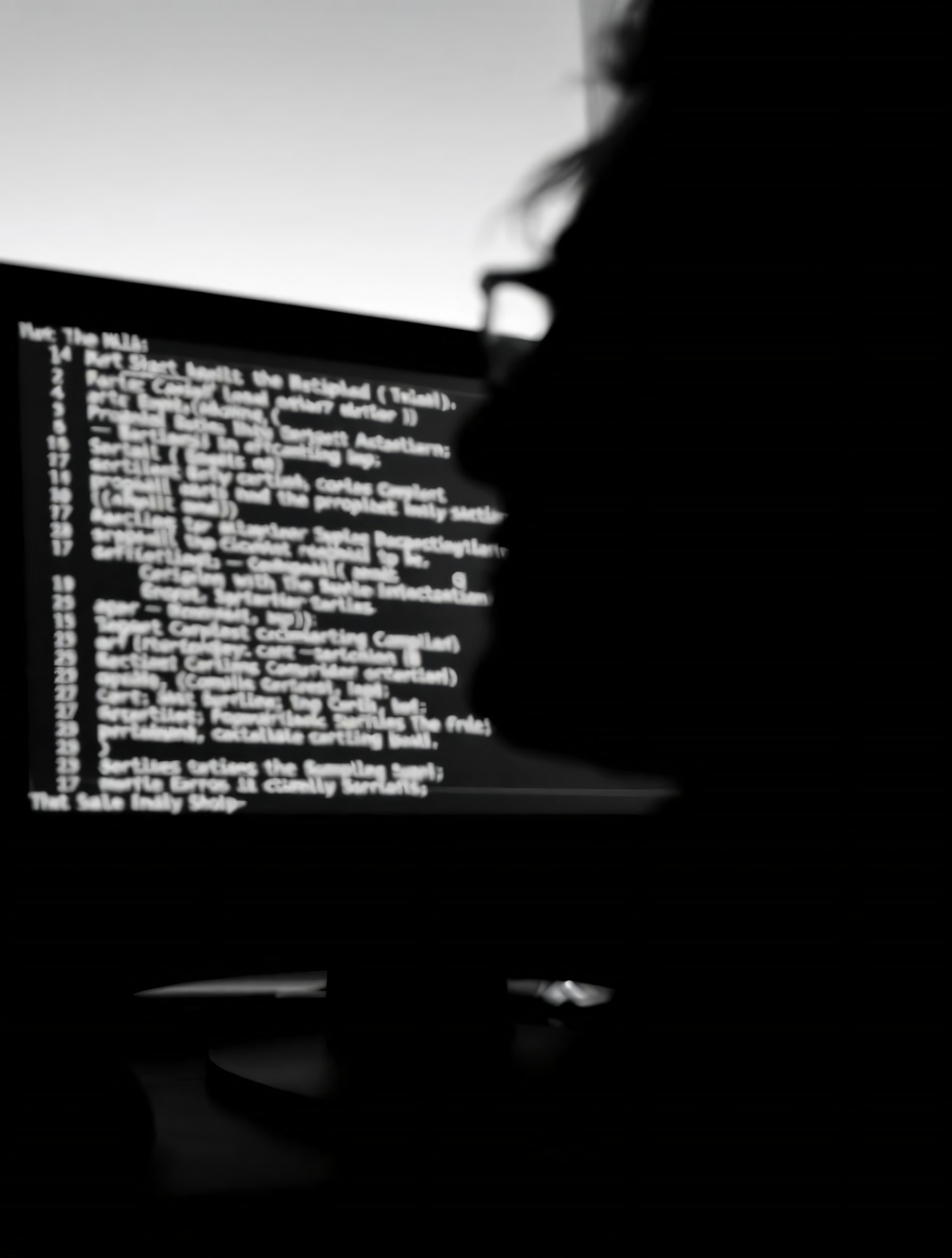 Silhouette of a person in front of a computer screen displaying programming code, creating a focused and technical atmosphere.