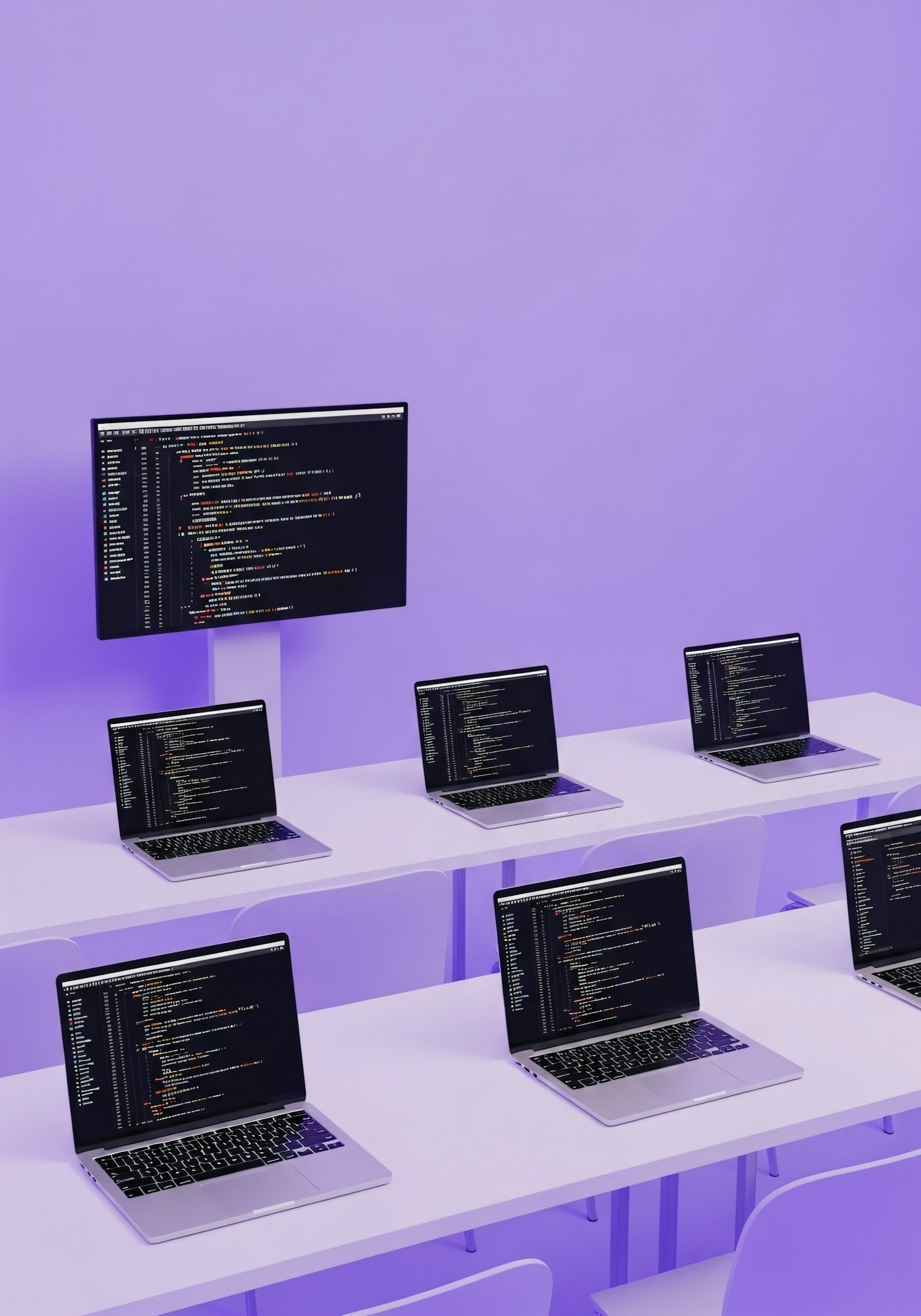 A modern classroom with laptops displaying code on white desks, illuminated by purple lighting, ideal for coding workshops or tech training.